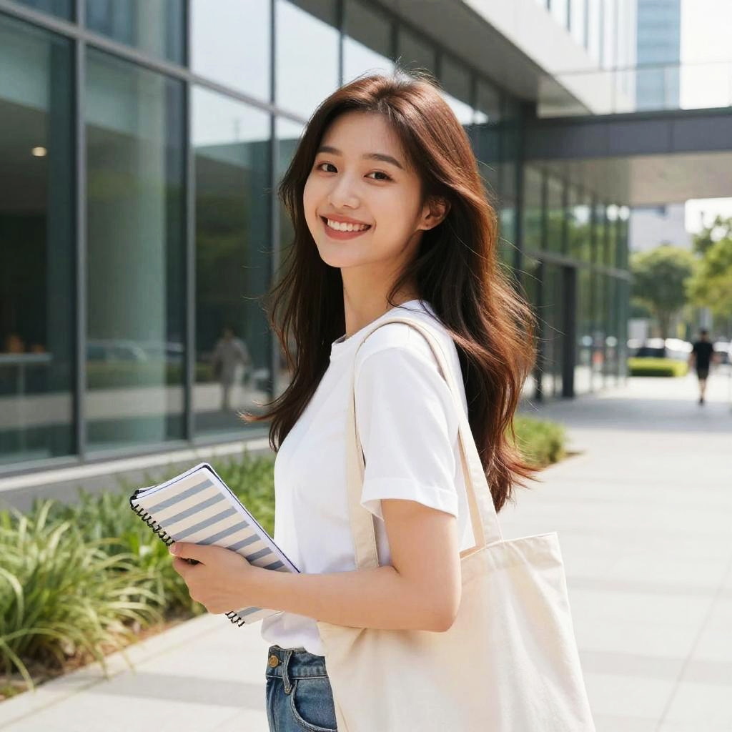 Photograph of two young women walking on a paved path with black railings. The woman on the left has long brown hair, wears a white blazer over a black top, blue jeans, and carries a black backpack. The woman on the right has her hair in a high bun, wears a green sweater, black pants, and carries a yellow folder. They're smiling and chatting, with trees and a modern building in the background.