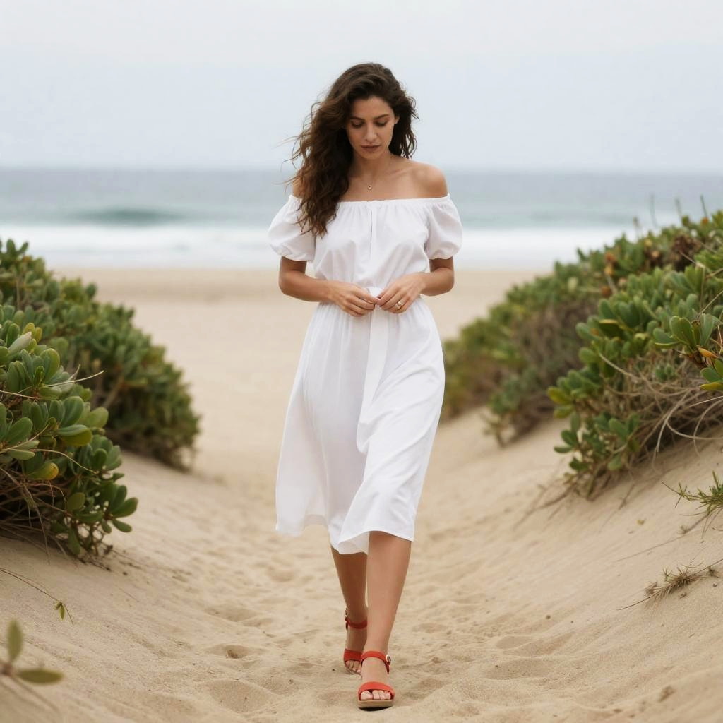 Woman with wavy brown hair, wearing off-shoulder white dress and red sandals, standing on sandy beach path. She looks down, adjusting dress. Green shrubs on either side. Overcast sky. Ocean in background. She is centered, with a slight tilt to the right.