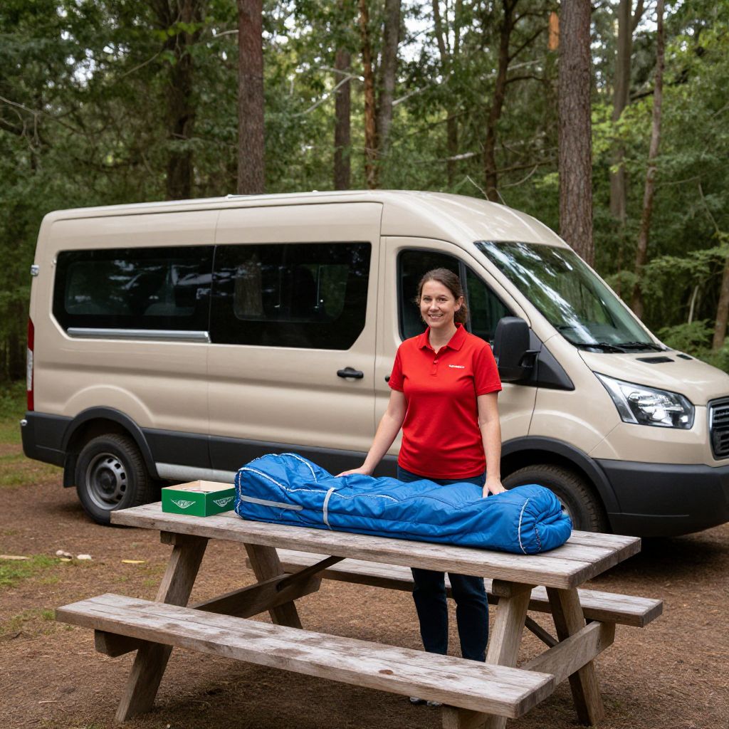 Catered camping experience unfolds in a serene forest setting, featuring a beige Ford Transit van parked beside a wooden picnic table where a woman in a red shirt stands, smiling near a neatly folded blue sleeping bag and a green box.