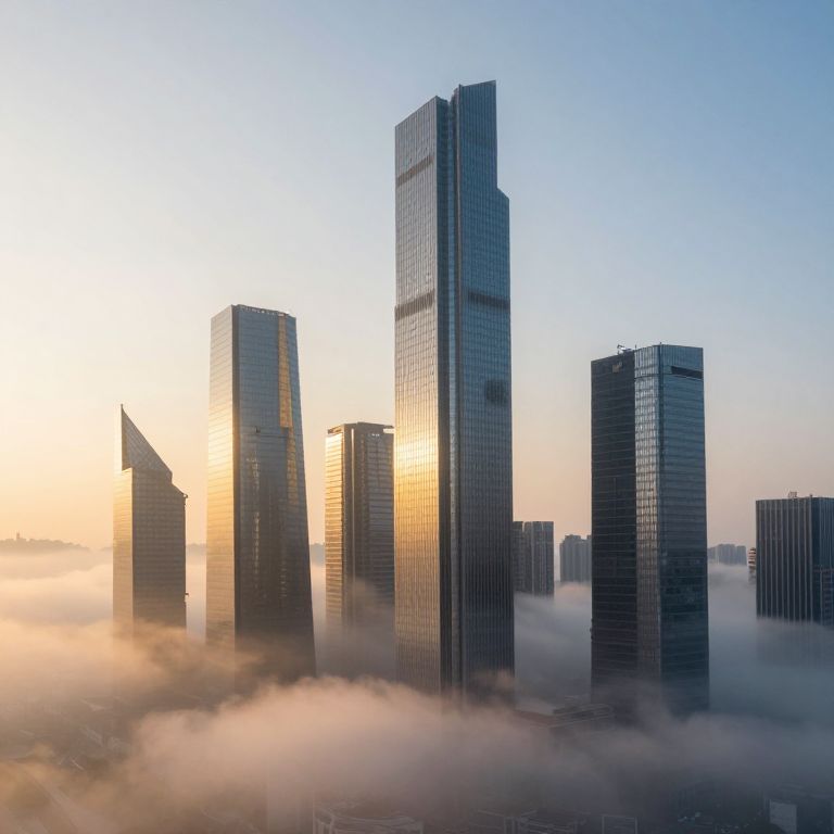 Photograph of modern skyscrapers with reflective glass windows at sunrise, partially shrouded in morning fog, creating a serene, urban skyline.