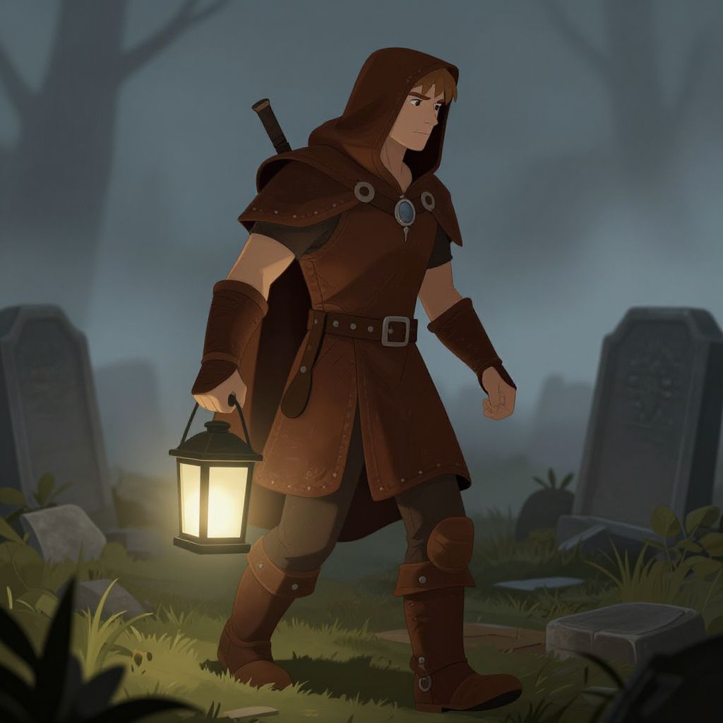 Animating Artist DnD a human light cleric. Leather armor with a hood pulled low. Patrolling a foggy cemetery. Holding a box lantern emitting white light.,