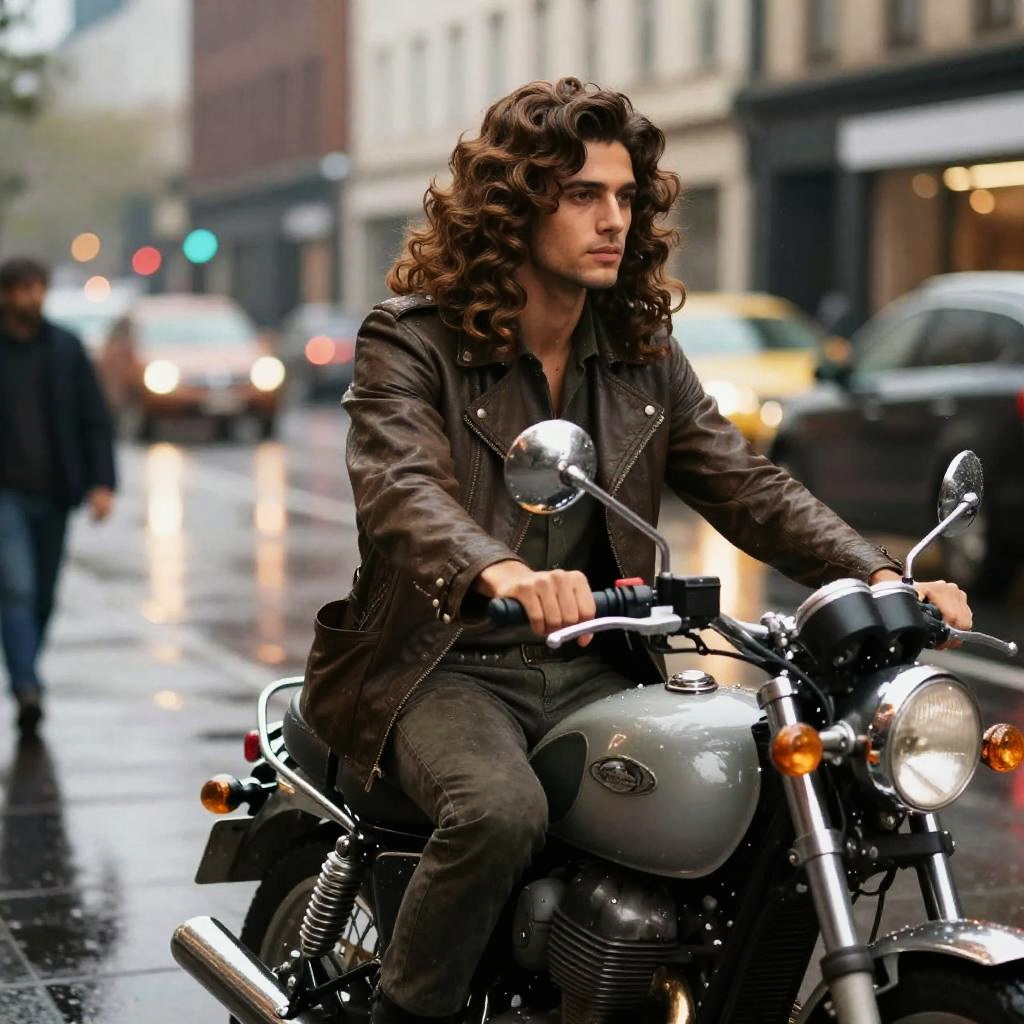 Dynamic action shot of a Seitenscheitel Mann riding a motorcycle, leather jacket, wind blowing through the distinct side-parted hair, vibrant city lights in the background, high energy, detailed realism