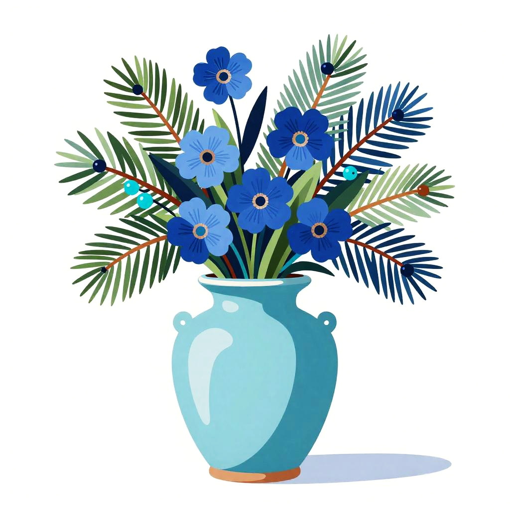 Contemporary still-life digital illustration featuring a matte cyan porcelain jar filled with elongated evergreen fronds, dotted cobalt blue flowers, and small turquoise berries. Modern abstract vector style with bold shapes, crisp edges, and matte-gloss contrast on a clean white background. Vivid blue and green colors with refined lighting and a serene mood.