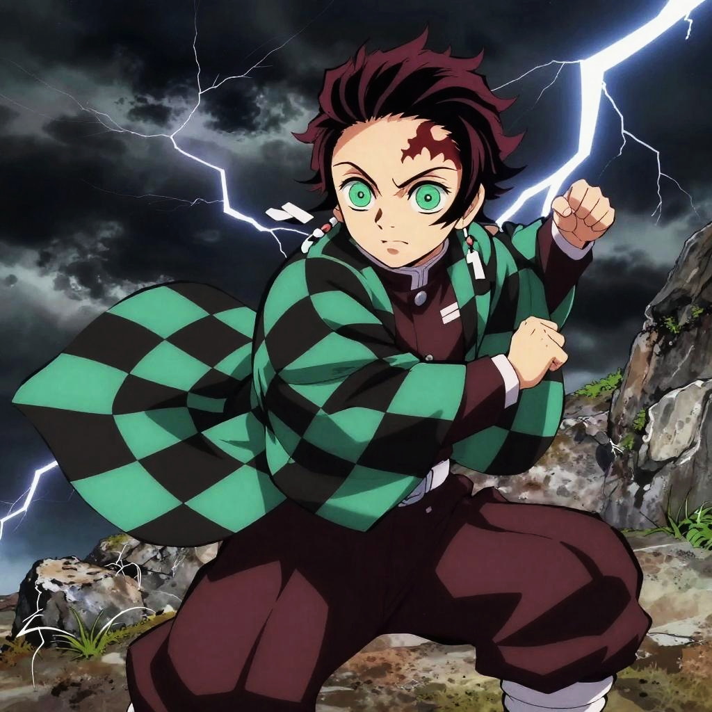 Demon Slayer anime girl in battle ready stance, fiery red hair tied back, vibrant clothing with subtle bloodstains, surrounded by supernatural blue flames, ancient shrine ruins behind her