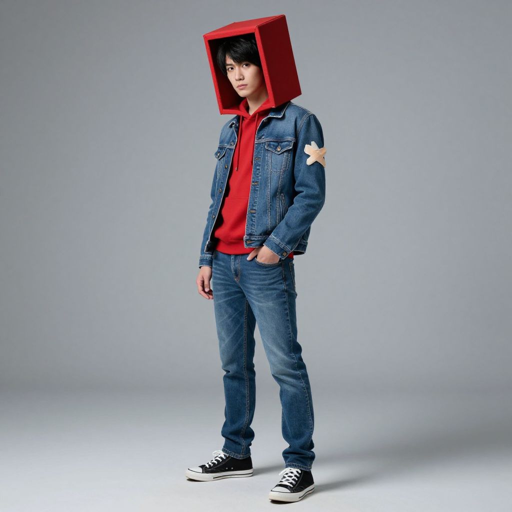 "turning red box costume, 1boy, male focus, solo, pants, hood, full body, black hair, standing, aura, looking at viewer, hood up, hand in pocket, denim, shoes, jeans, jacket, grey background, bandages, realistic, sneakers Realistic photo of casual sexy person with pretty face"