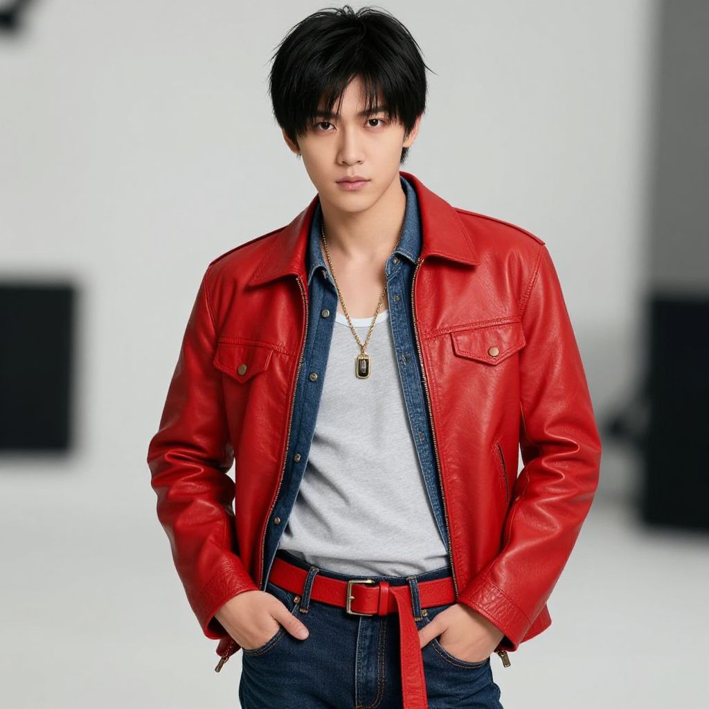 Photograph of a young man standing against a plain gray background. He has fair skin, short black hair, and a serious expression. He wears a red hoodie with a large, red, rectangular hood that has a flat top, a blue denim jacket with a patch on the left sleeve, a red t-shirt, blue jeans, and black and white sneakers. His hands are casually in his jeans' pockets. The lighting is even, highlighting the textures of the denim and the vibrant red of his hoodie and shirt. The overall style is modern and casual.