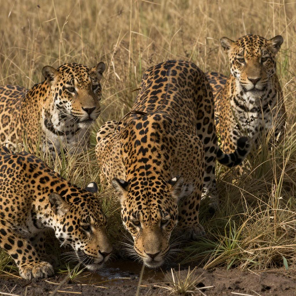 Photograph of a leopard mother and her cub walking side by side in a dry, grassy field. The mother's eyes are focused forward, while the cub looks slightly downward. Both have golden coats with black spots. The camera angle is eye-level, capturing them from the front. Bright sunlight casts clear shadows. Depth of field keeps the leopards in sharp focus, with the background slightly blurred. The lighting is natural, highlighting their fur patterns.