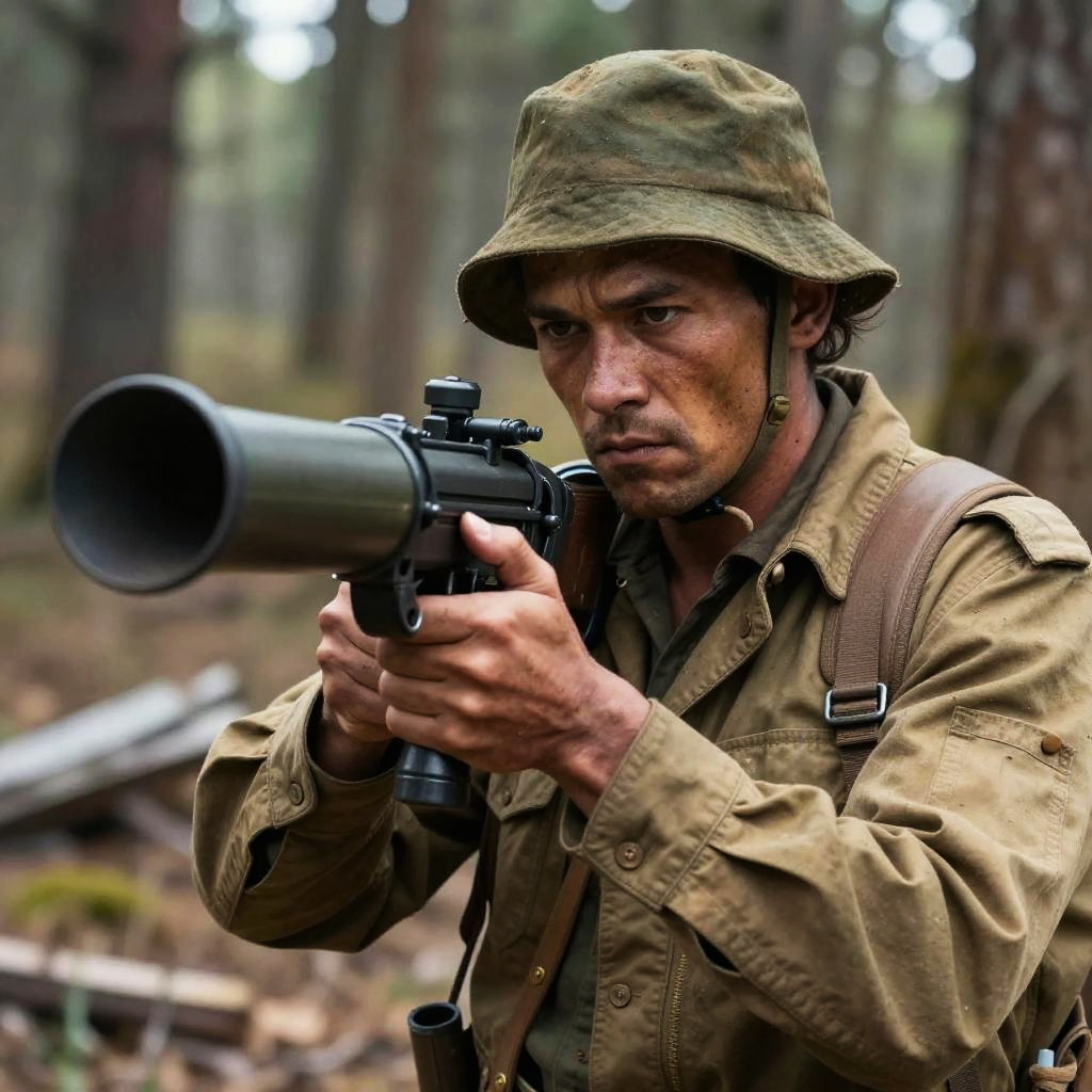 Realistic photo.Cinematic close-up of a rugged freedom fighter gripping a rocket launcher tightly while preparing to fire in a ruined forest. realistic photo