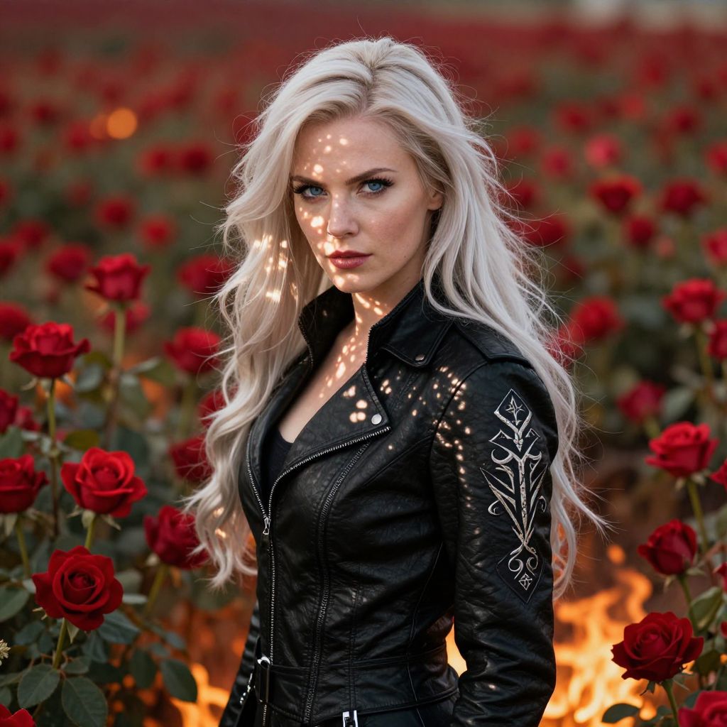 Envision a captivating portrait of a contemporary Valkyrie, her piercing blue eyes and cascading platinum blonde hair exuding allure. Amidst a fiery field of vibrant red roses, she stands tall, their dancing petals contrasting sharply with her cool-toned attire—a sleek black leather jacket adorned with intricate Norse runes. As light filters through the blossoms, casting dappled shadows across her face and clothing, it creates an enchanting interplay between warmth and icy elegance. This moment suspended in time captures a dynamic blend of fierce strength and ethereal beauty.