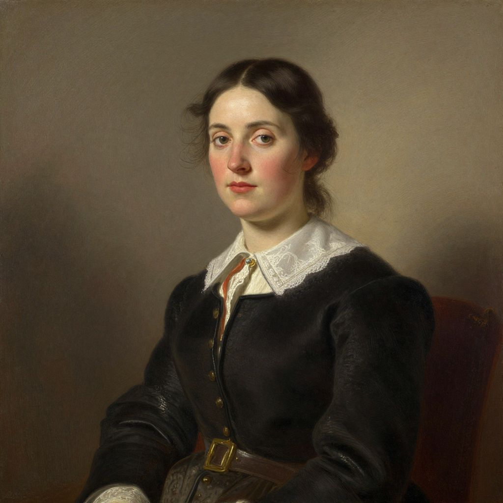 Photograph-style painting of a young Caucasian woman with pale skin, dark brown hair in a bun, wearing a black dress with white lace collar and gold