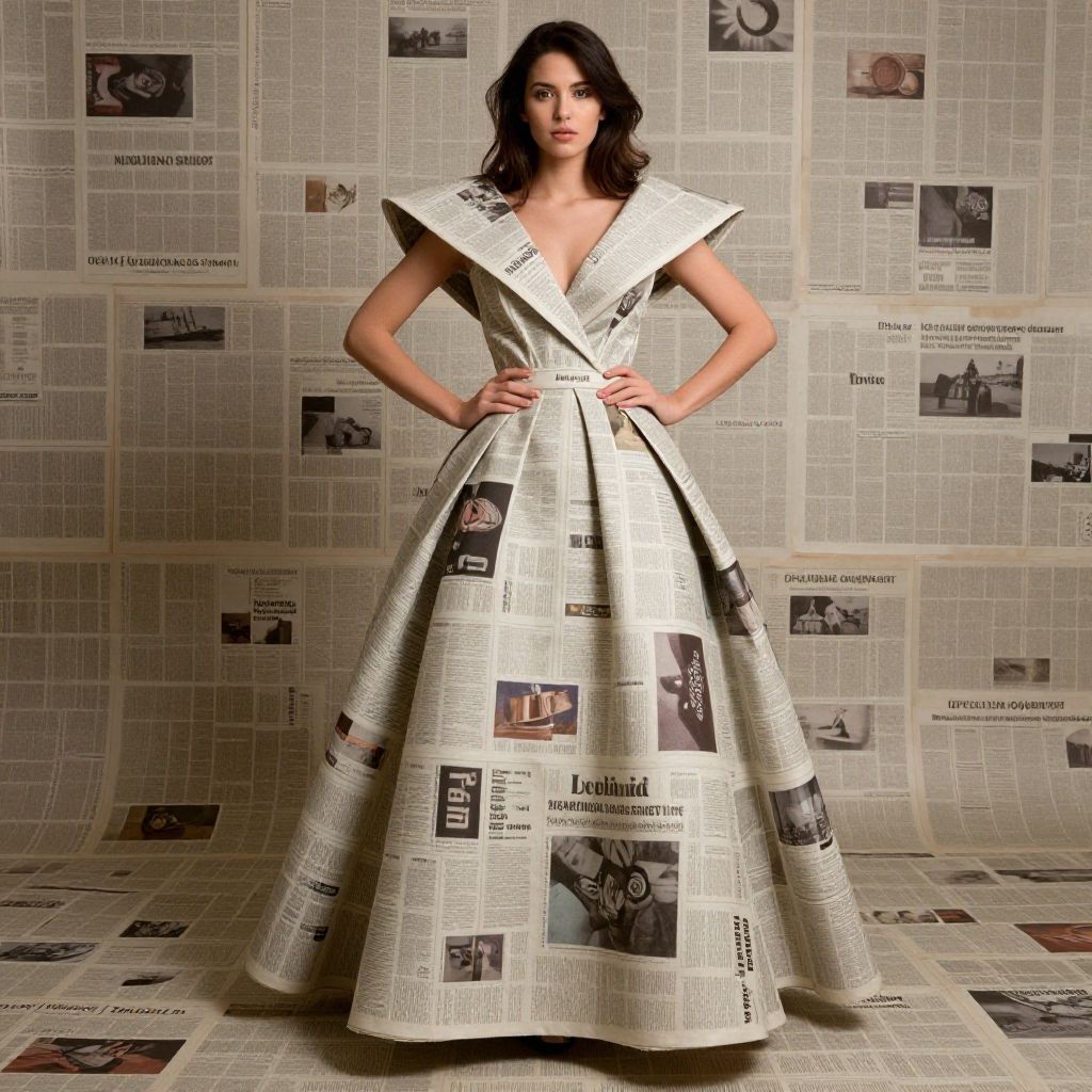 This striking image features a woman in a stunning gown made entirely of newspaper, showcasing a blend of fashion and avant-garde art. Set against a backdrop of vintage newspaper clippings, the dress emphasizes creativity and sustainability in design.