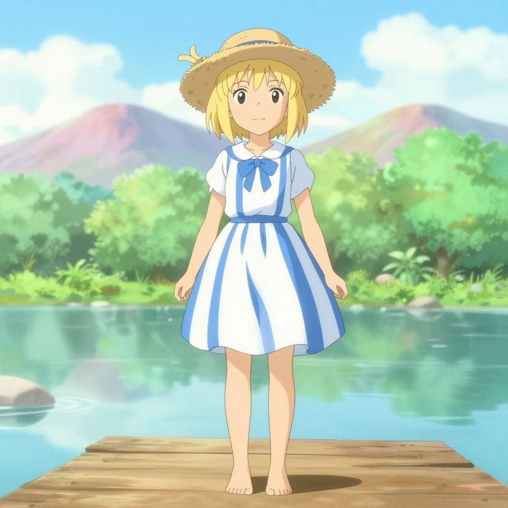Anime-style illustration of a confident young blonde girl with a bob cut standing barefoot on a wooden bridge over calm water. She is wearing a white and blue striped summer dress with a bow and a wide-brimmed straw sun hat with fluttering ribbons. The background features soft pastel-colored mountains and lush greenery under a bright daytime sky, creating a peaceful outdoor setting inspired by Studio Ghibli aesthetics.