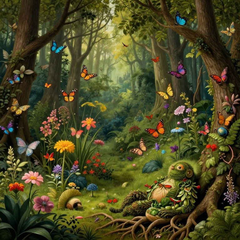 A surreal, detailed landscape inspired by Hieronymus Bosch, featuring a lush forest floor filled with diverse and colorful flowers. Numerous vibrant butterflies flutter around the scene beneath towering trees. In the foreground, a fantastical creature made from leaves, moss, and roots rests peacefully among tree roots, symbolizing the harmony of nature. The image blends realism and imagination to create a captivating natural ecosystem.