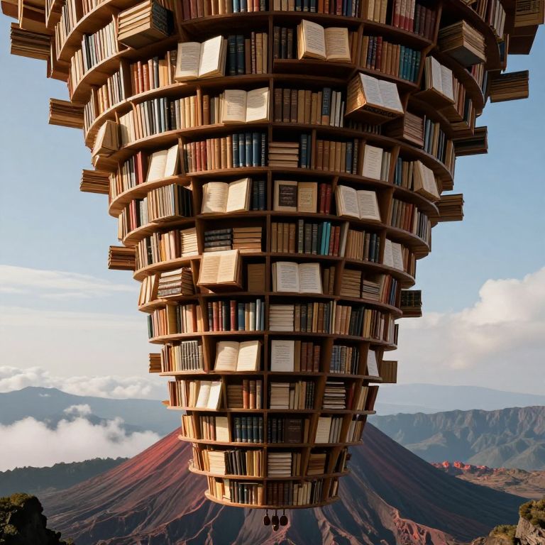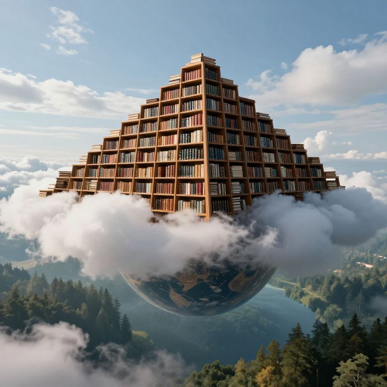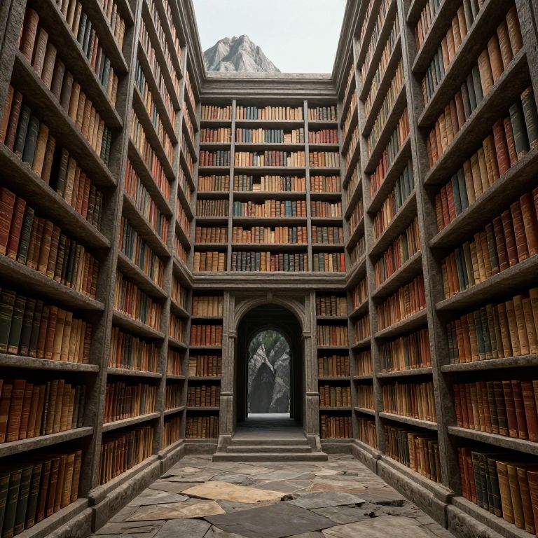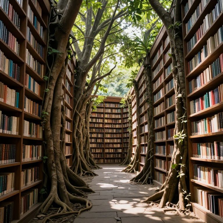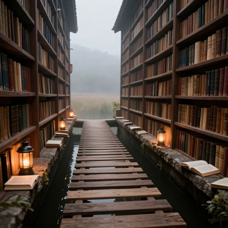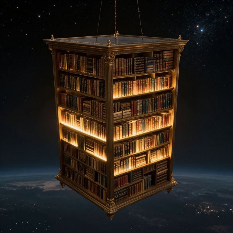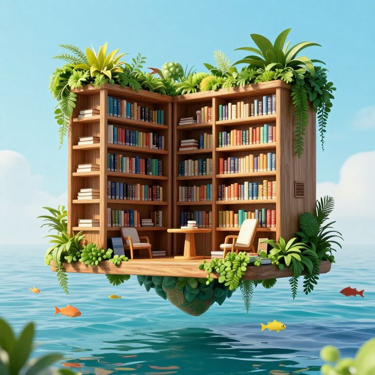 Gondolas suspended by cables glide through a cavernous underwater passage, their transparent sides revealing shelves lined with books illuminated by ethereal blue light, while a tranquil river flows below amidst moss-covered cliffs.