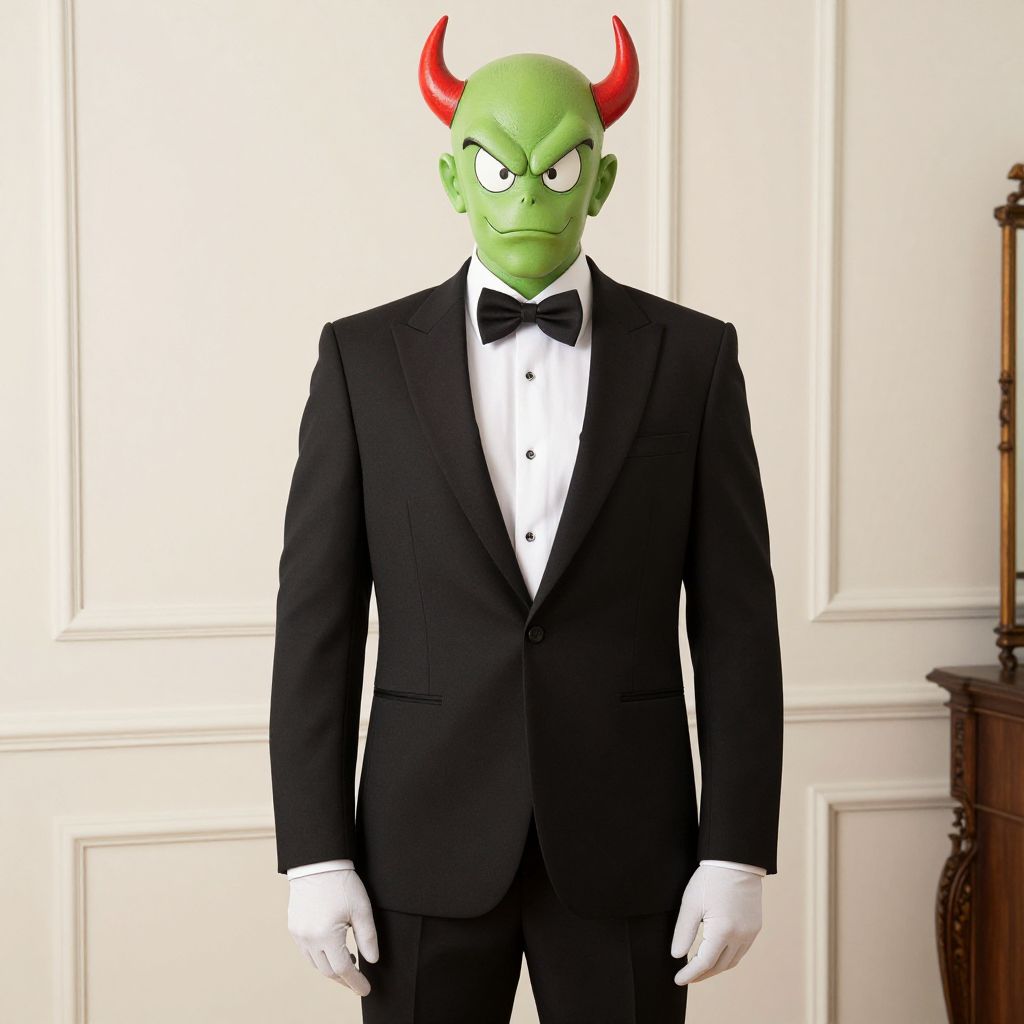 Photograph of a green-skinned, cartoonish demon character with red horns, wearing a black tuxedo, white dress shirt, black bow tie, and white gloves. The character has a stern expression, with narrowed eyes and a slightly furrowed brow. The background features white paneled walls and a wooden cabinet on the right. The demon's skin is smooth, and the tuxedo is formal and well-fitted, contrasting with the character's otherworldly appearance. The lighting is bright and even, highlighting the character's vivid colors and the details of the clothing.