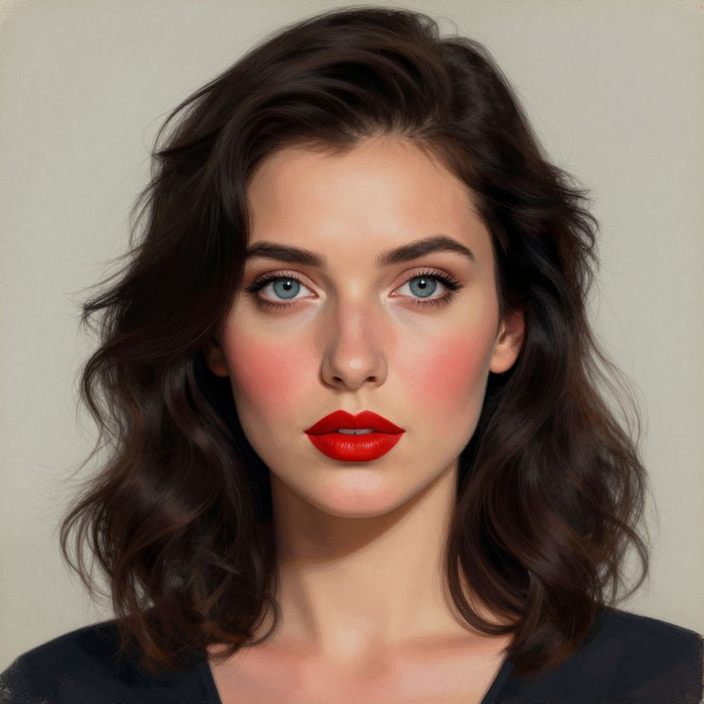 A digitally rendered portrait by Ukrainian figurative painter Katya Gridneva [Катя Гриднева], showcasing a woman with dark, wavy hair and striking blue eyes, adorned with bold red lipstick and blush, set against a minimalist background with a vintage aesthetic.