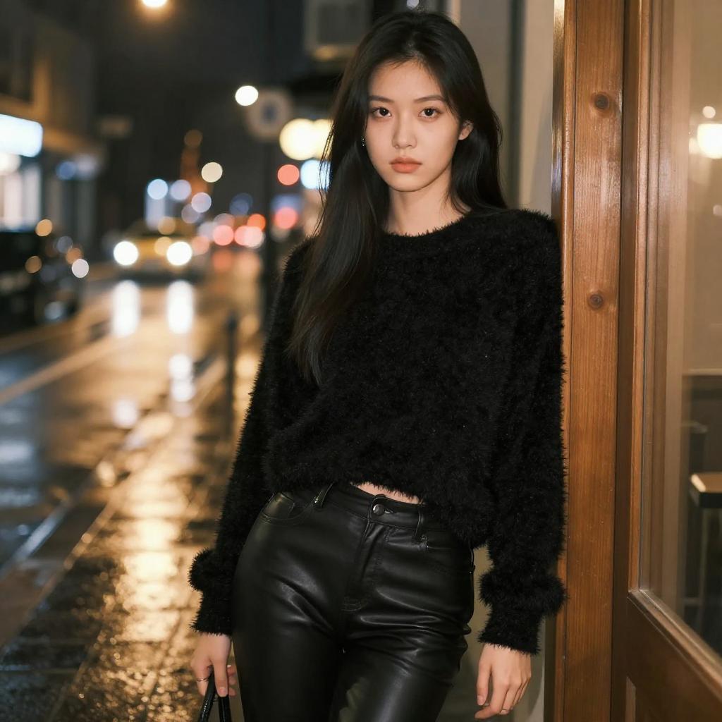 Photograph of a young woman with long, straight black hair, leaning against a wooden door frame at night. She's wearing a black, textured, fuzzy sweater and tight black leather pants. Her expression is neutral, with a slightly serious look. The background is a blurry, bokeh-lit city street with wet pavement reflecting streetlights, creating a warm, golden glow.