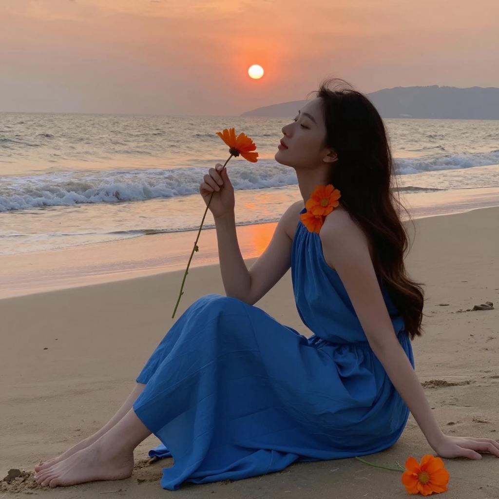 A young woman sitting on a sandy beach at sunset, wearing a flowing blue dress with orange flower accents, holding an orange flower in her hand, soft waves in the background, warm orange glow from the setting sun, realistic natural skin tones, gentle and peaceful atmosphere, romantic realism style, painterly texture