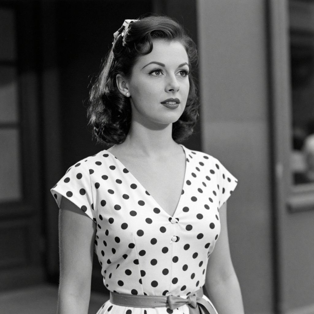 A vintage black-and-white photograph captures a woman in a stylish polka-dot dress, embodying retro fashion with dramatic lighting and high-definition detail, reminiscent of mid-20th-century street photography.