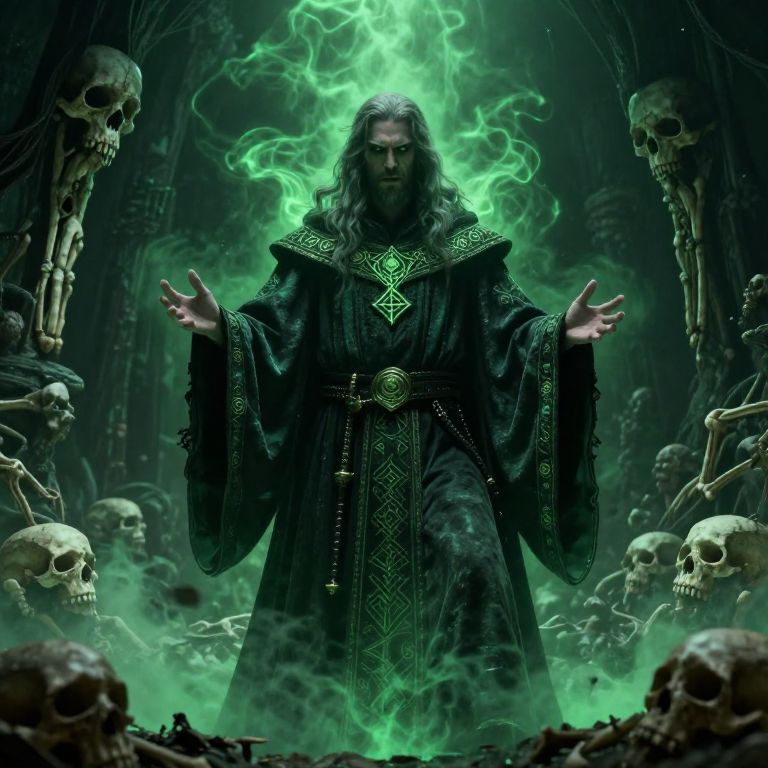Digitally illustrated dark fantasy scene: Long-haired, green-aura emitting wizard in ornate black robe, surrounded by floating skulls and green mist, standing