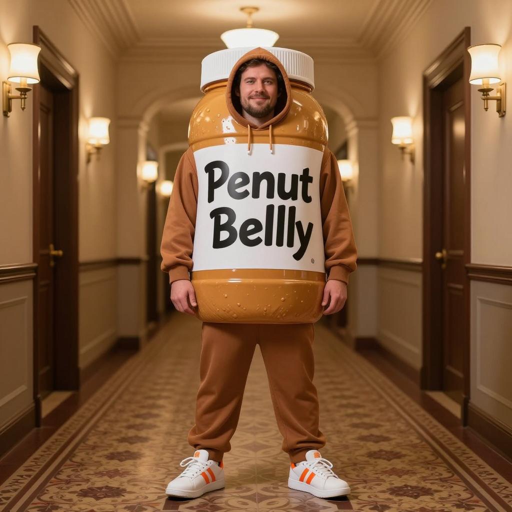 Photorealistic image of a man wearing a peanut butter jar mascot costume labeled 'Penut Belly,' standing in a warm-lit ornate hallway with patterned floors and symmetrical perspective. The man has a medium build and light skin, dressed in a brown hoodie and matching pants underneath the costume, along with white sneakers featuring orange stripes. The hallway features gold and brown tones with bright wall sconces and ceiling lighting.
