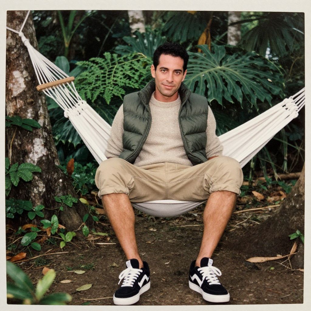 A man, green puffer vest, beige crew neck sweater, khaki jogger shorts, black and white skate sneakers, relaxed fit for comfort, secluded cove, lush tropical foliage, hammocks strung between trees, vintage photo, relaxed smile, enjoying the moment. Man has masculine face and piercing eyes