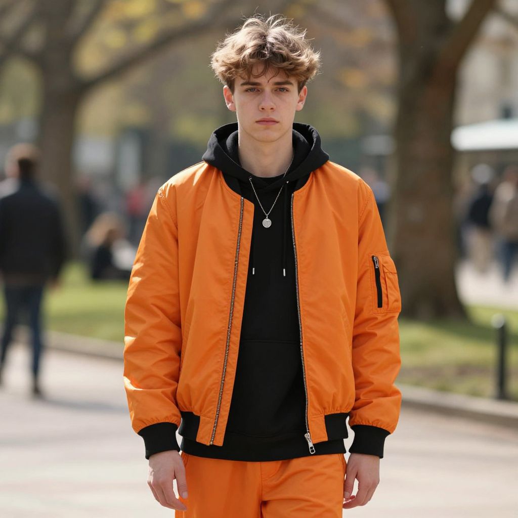 Photograph of a young man with tousled brown hair, wearing an orange bomber jacket, black hoodie, and matching pants, standing in a sunlit