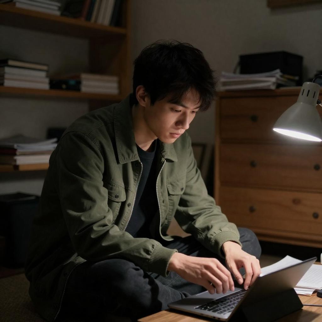 Asian man with dark hair and mustache, wearing a brown jacket, leaning over a desk, writing with a pen. Black desk lamp illuminates his focused expression. Background includes a window and book. Intense focus on writing.