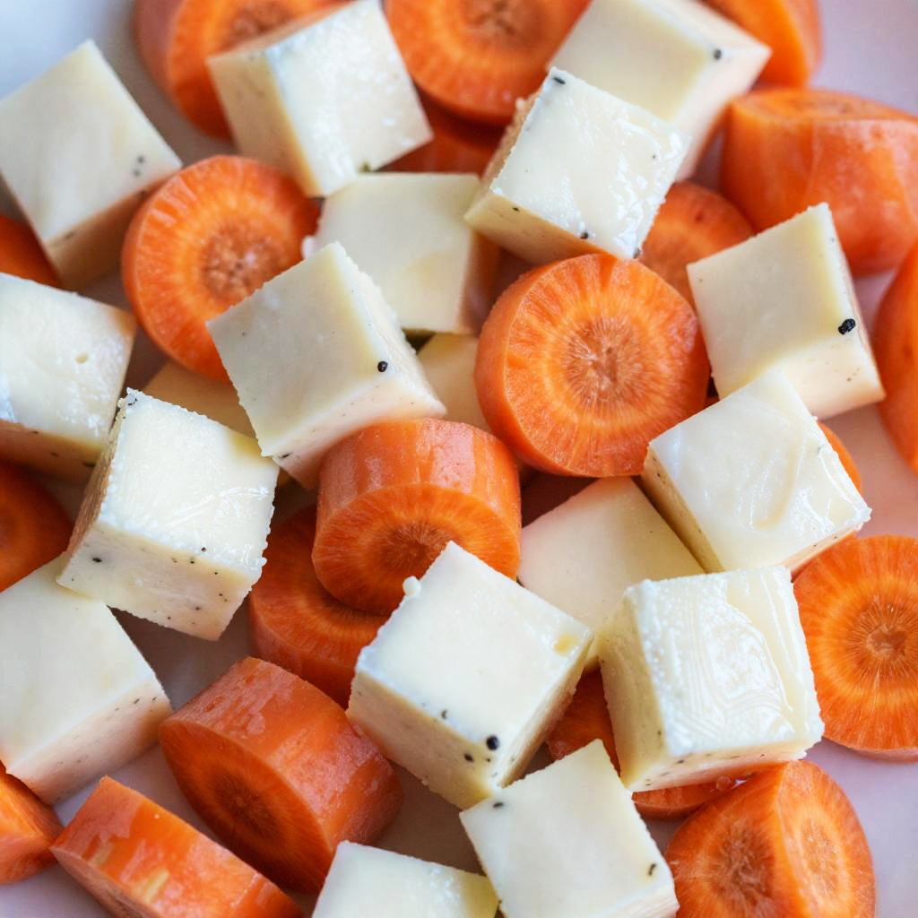 Close-up photo of mixed diced cheese and carrots. The cheese cubes are white with small black specks, suggesting herbs or spices, and have a slightly glossy texture. The carrot pieces are bright orange, fresh-looking, and slightly chunky. The cheeses and carrots are randomly stacked, creating a colorful and textured contrast. The background is blurred, focusing attention on the food.
