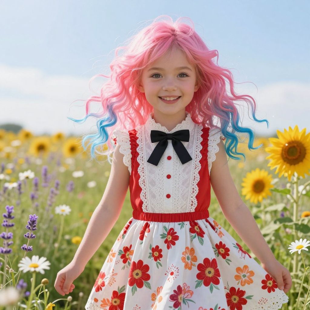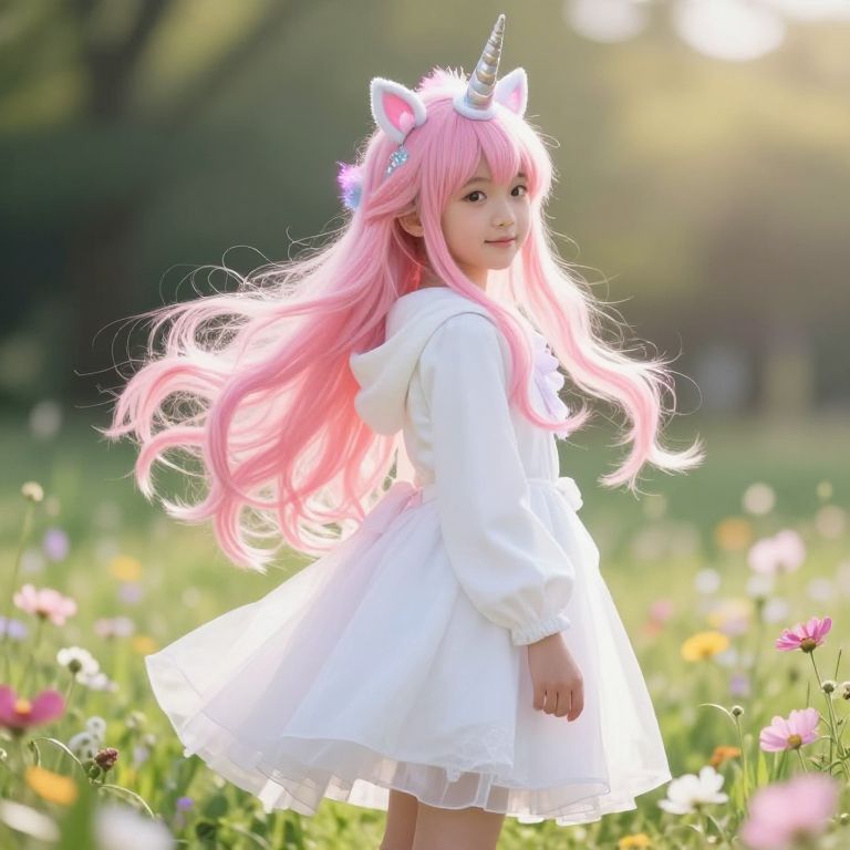 A beautiful girl with long, flowing pink hair that cascades down her back, wearing a delicate unicorn hat with shimmering silver accents and soft glowing pink magic. She is dressed in a pristine white outfit featuring a soft white hood that covers her shoulders and a flowing white skirt that reaches her knees. The scene is set in a magical, sunlit meadow with blooming flowers and a gentle breeze, giving the impression of wonder and enchantment. Her expression is joyful and serene, as if she's just discovered a hidden secret of the fairy world.