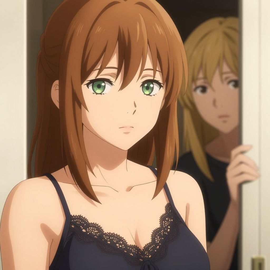 This detailed illustration features a close-up of a thoughtful young woman with light brown hair and striking green eyes, dressed in a dark lace-trimmed camisole. The anime-style digital artwork emphasizes realistic shading and highlights, capturing both the softness of her skin and the intensity of her gaze, while another woman with blonde hair peeks from behind a door in the background.