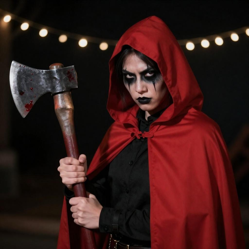 Photograph of a person in a dark, hooded, long black robe with shoulder armor, standing on a nighttime street. The person's face is painted white with black markings, and they have glowing eyes. They hold a chain in each hand, with blurred city lights and trees in the background.