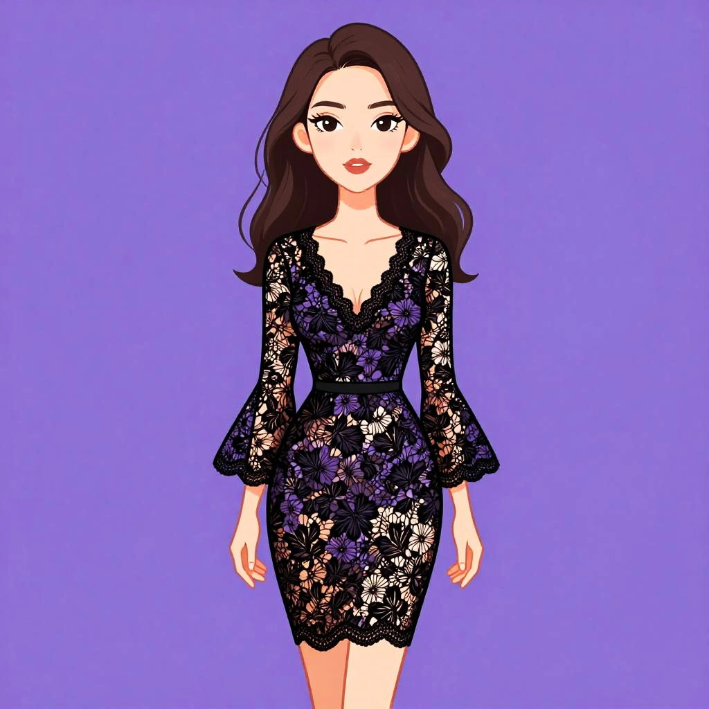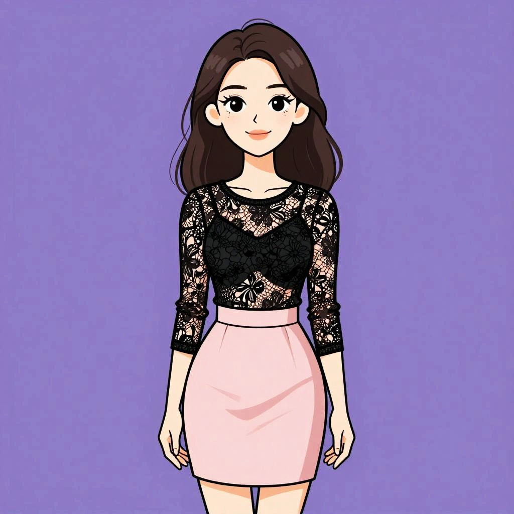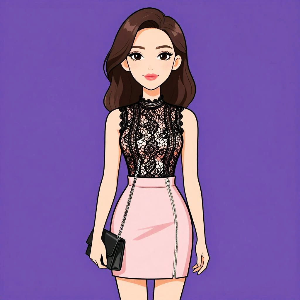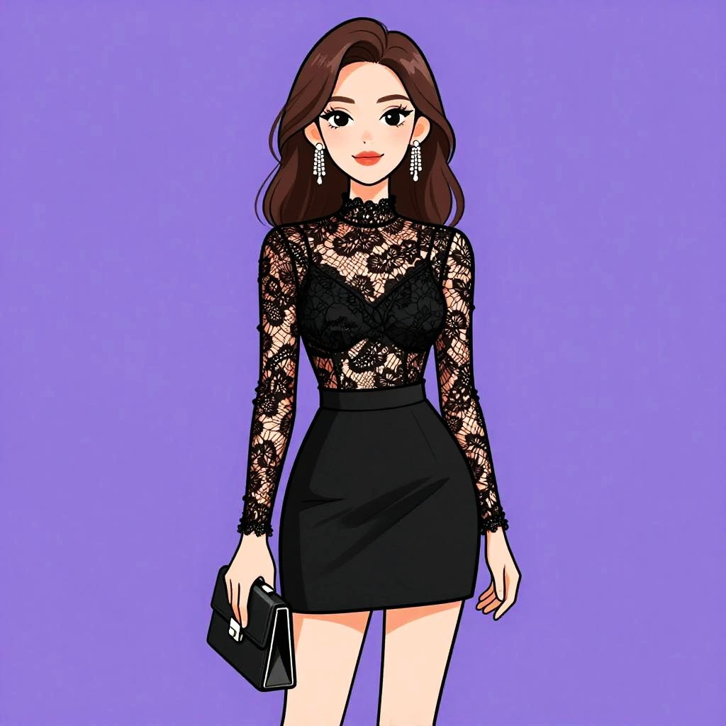 Woman with pretty face and pretty hair. Woman, evening wear, black lace top with long sleeves and high neckline, fitted silhouette, keyhole back, black flared mini skirt, high-waisted, silver chandelier earrings, black clutch with a structured design. --sref 1467