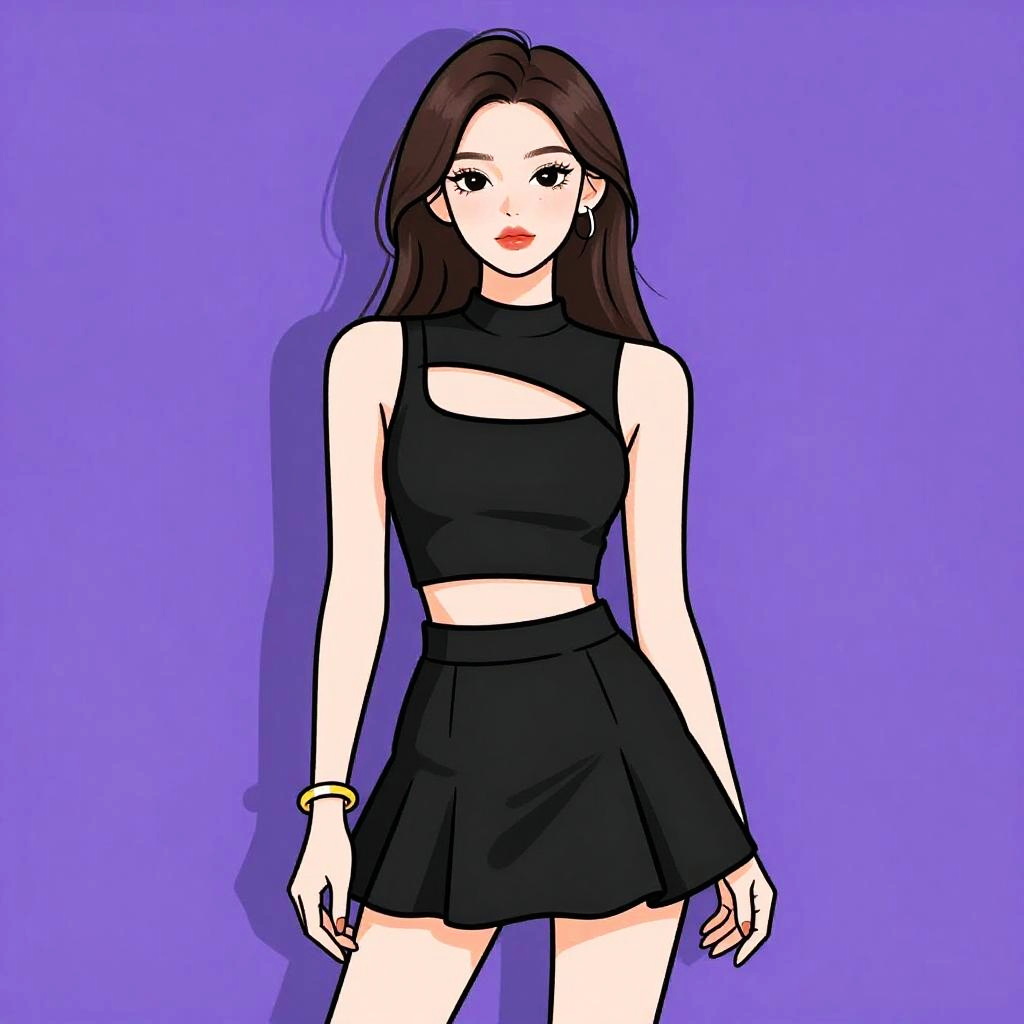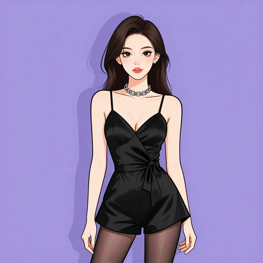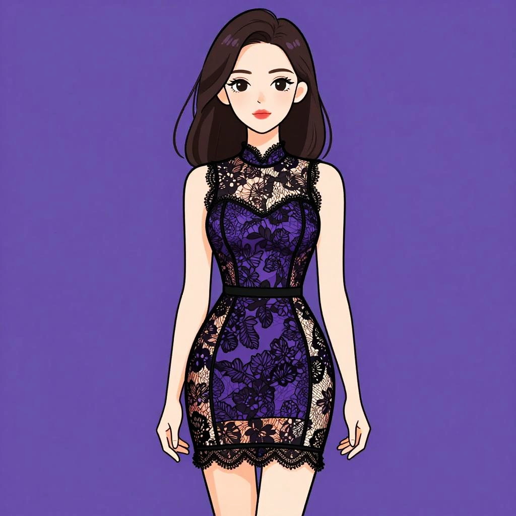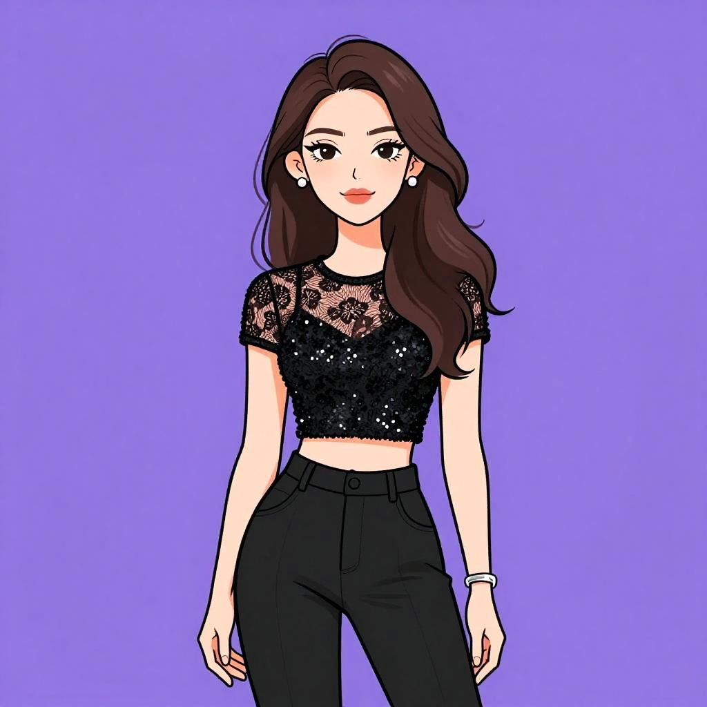 Woman with pretty face and pretty hair. Woman, evening wear, black lace top with long sleeves and high neckline, fitted silhouette, keyhole back, black flared mini skirt, high-waisted, silver chandelier earrings, black clutch with a structured design. --sref 1467