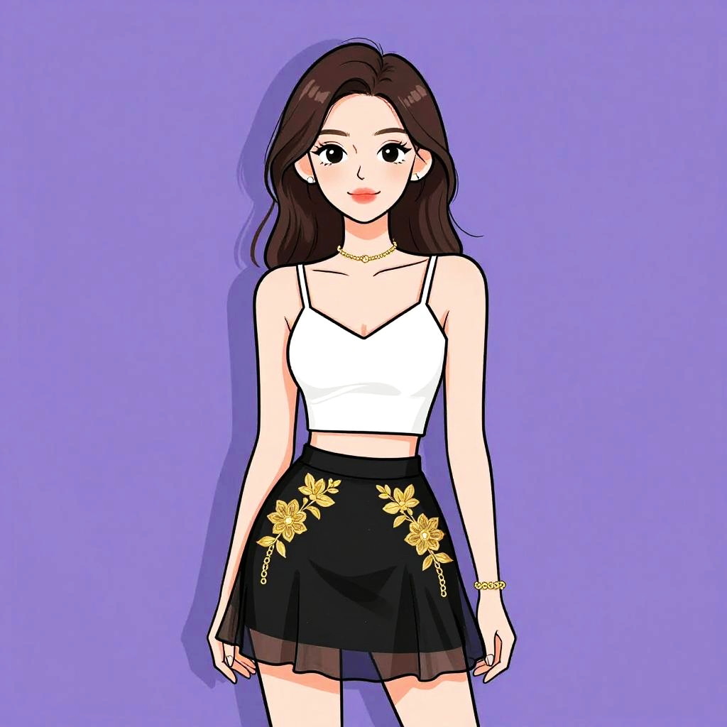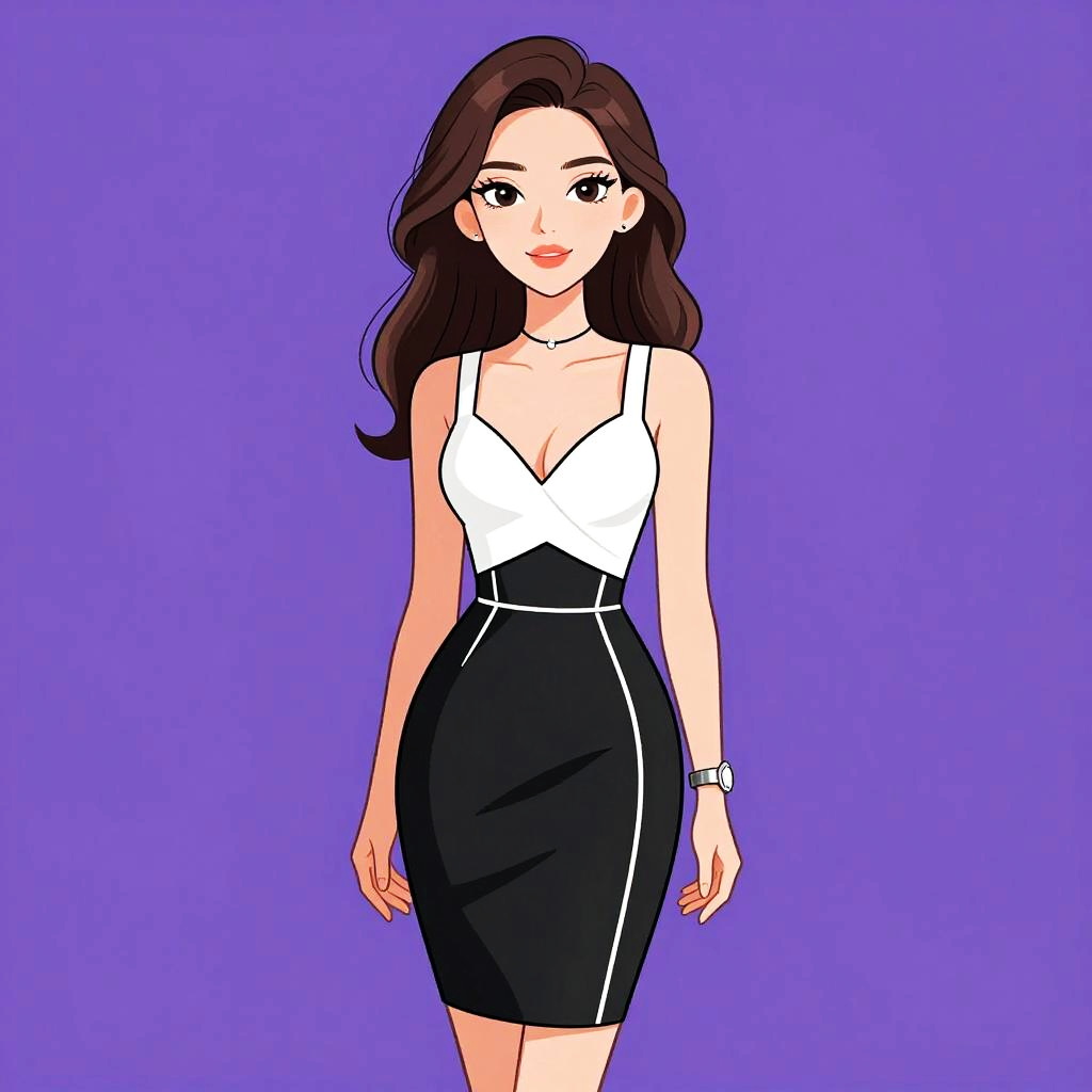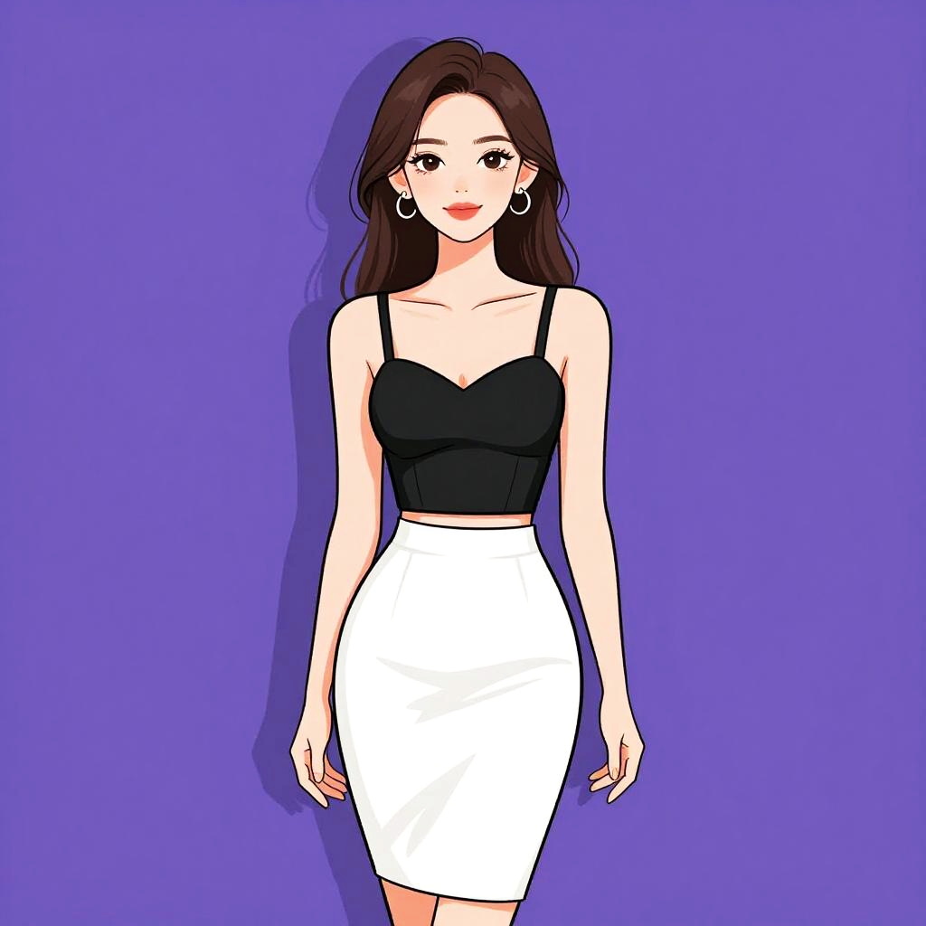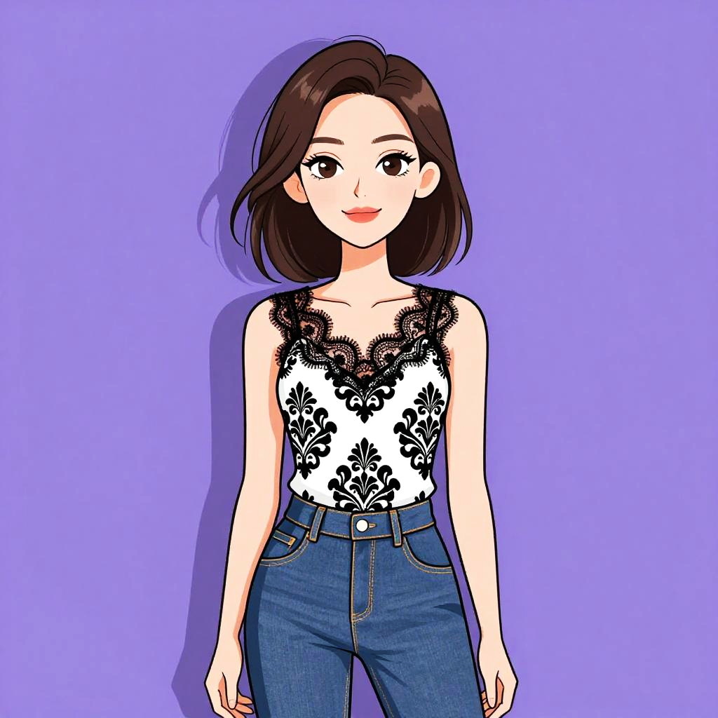 Woman with pretty face and pretty hair. Woman, evening wear, black lace top with long sleeves and high neckline, fitted silhouette, keyhole back, black flared mini skirt, high-waisted, silver chandelier earrings, black clutch with a structured design. --sref 1467