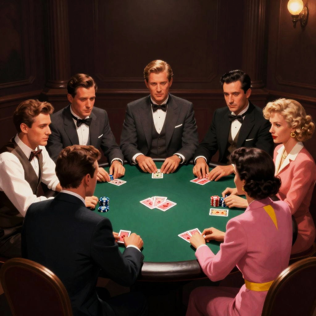 Sepia-toned illustration of six people at a formal racetrack event. Three men and three women sit at a table. Two men in bow ties and top hats lean forward, serving food. Women wear elegant dresses, one with a shawl. Background features more people and draped fabric. Intense facial expressions on men, neutral expressions on women. Silver serving tray and plates on table.