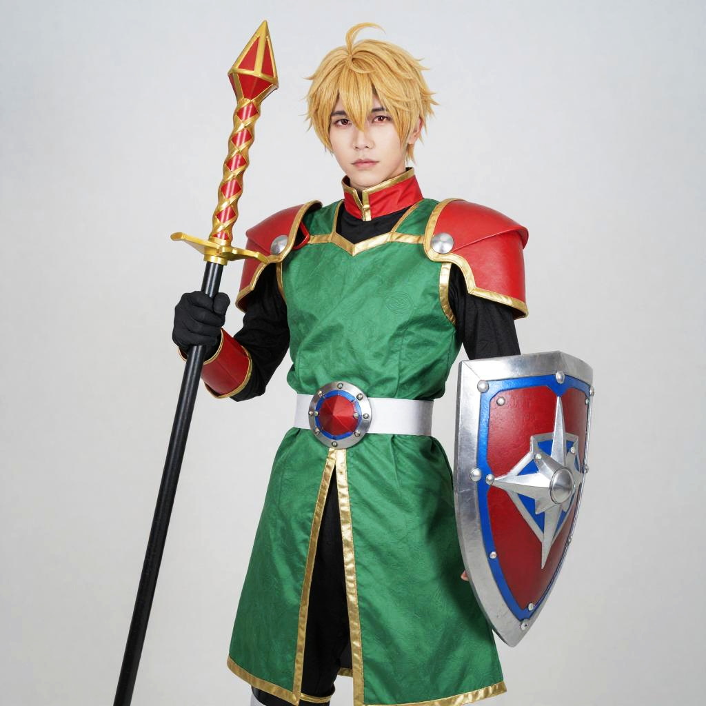 Cosplay The Rising The Shield Hero, male in a green and red outfit with a shield and shield