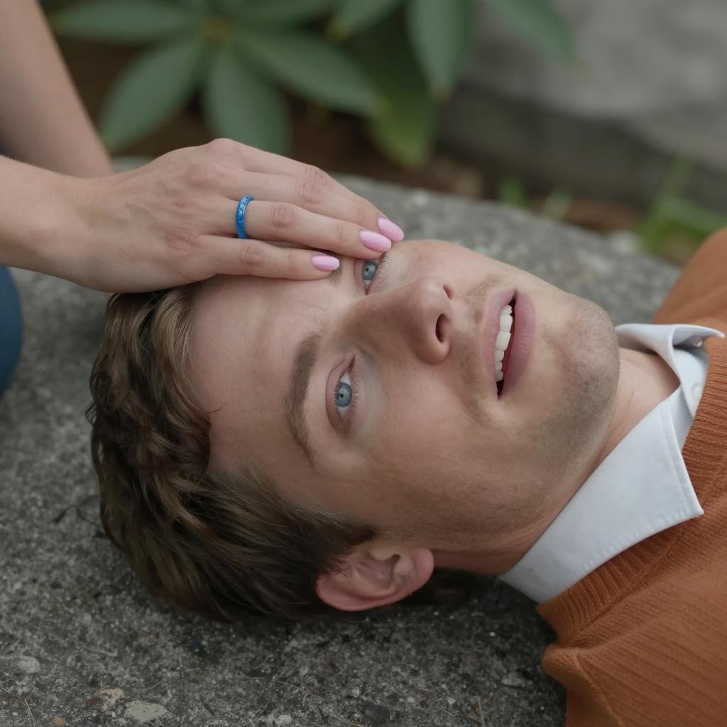 A man with light skin and blue eyes, lying on a rock. He has short brown hair and wears an orange sweater with a white collar. A woman's hand with a blue ring and light pink nail polish rests on his forehead. Green leaves are in the background. The man's mouth is slightly open, showing his teeth. Two people, with the woman's hand visible.