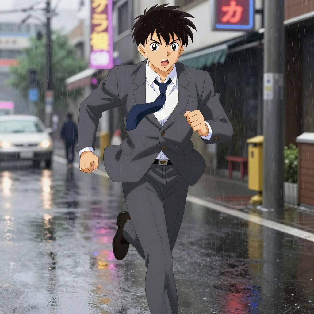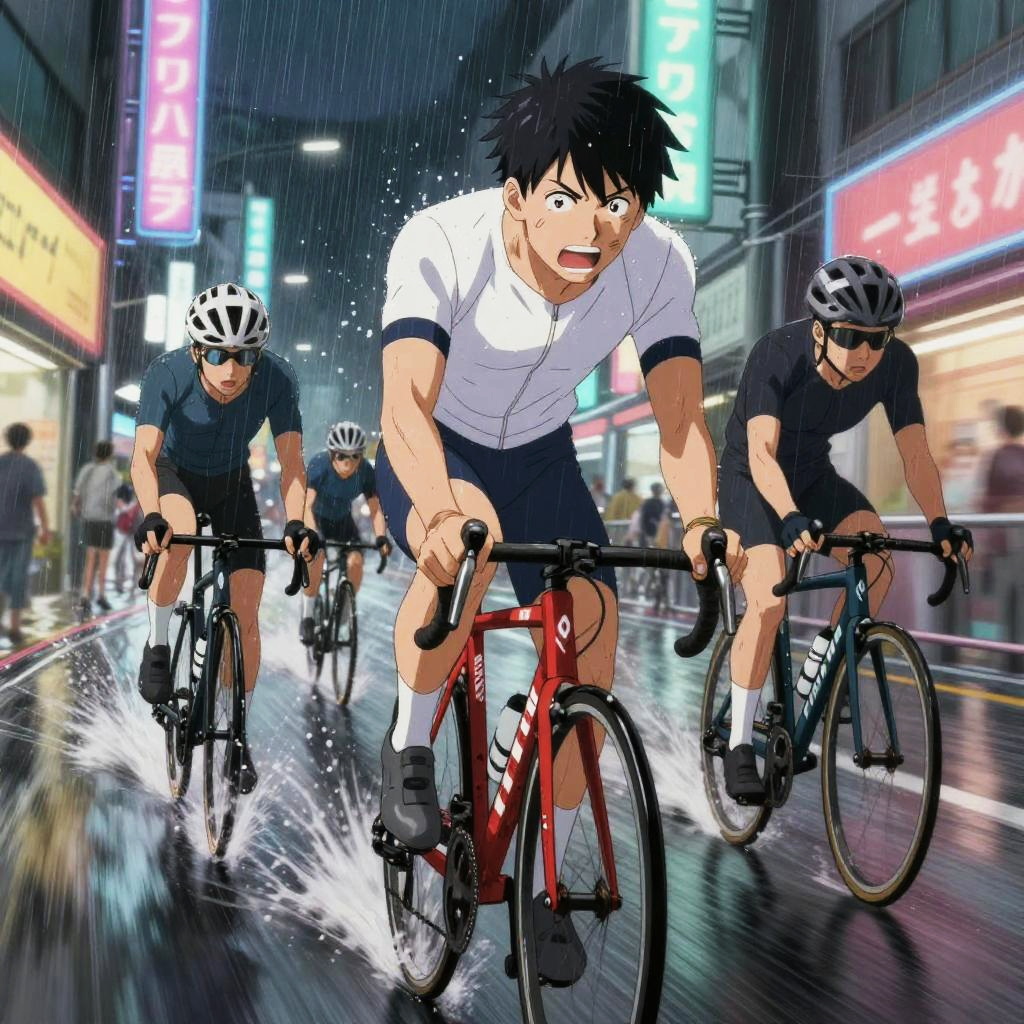 Anime biking race in a rainy urban environment, intense expressions, splashing water effects, colorful city neon signs, high-speed motion blur, cinematic anime style