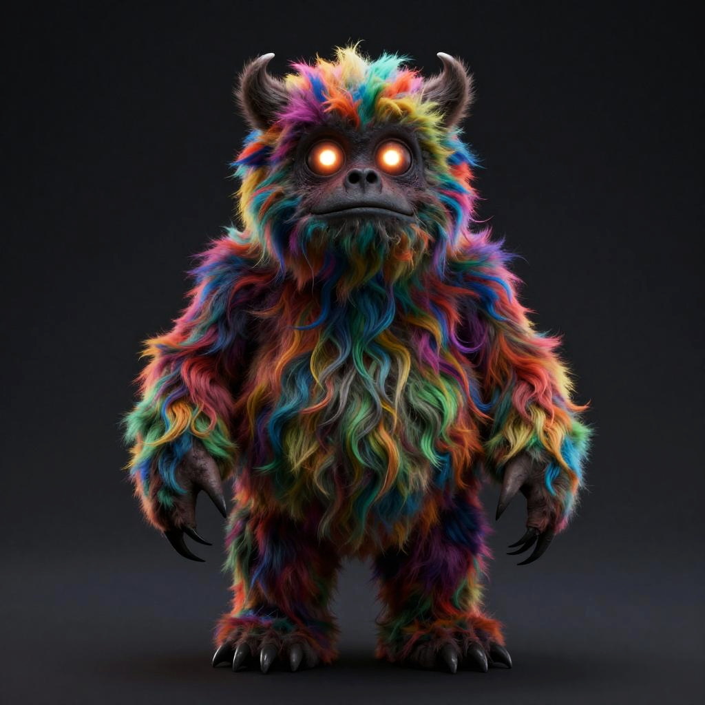 Digital art of a fluffy, rainbow-colored, humanoid creature with glowing orange eyes, dark fur, and sharp claws, standing against a black background.