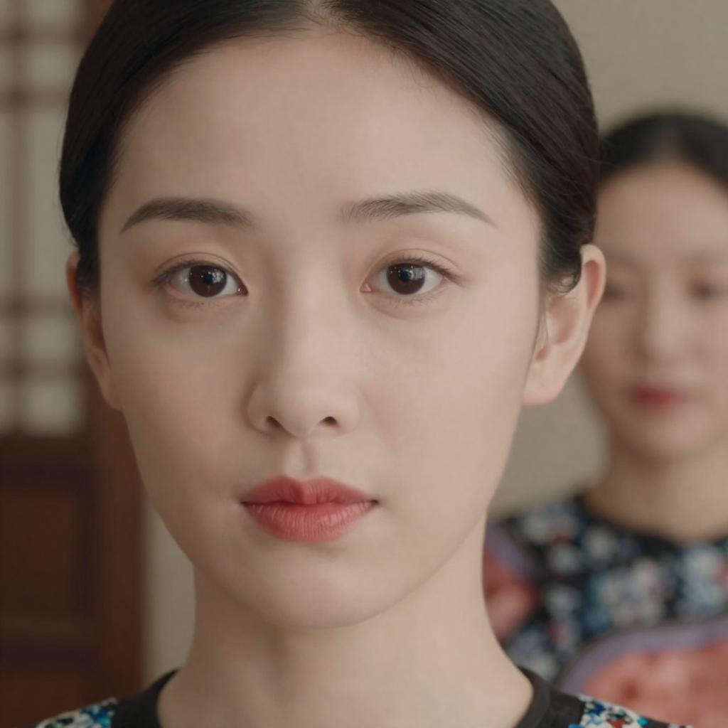 Close-up portrait of an Asian woman with fair skin, dark eyes, and red lips showing a neutral expression. She has black hair neatly styled. In the blurred background, another Asian woman with similar features is visible, wearing a floral-patterned traditional garment. The setting includes wooden and fabric elements in the background, suggesting an indoor environment.