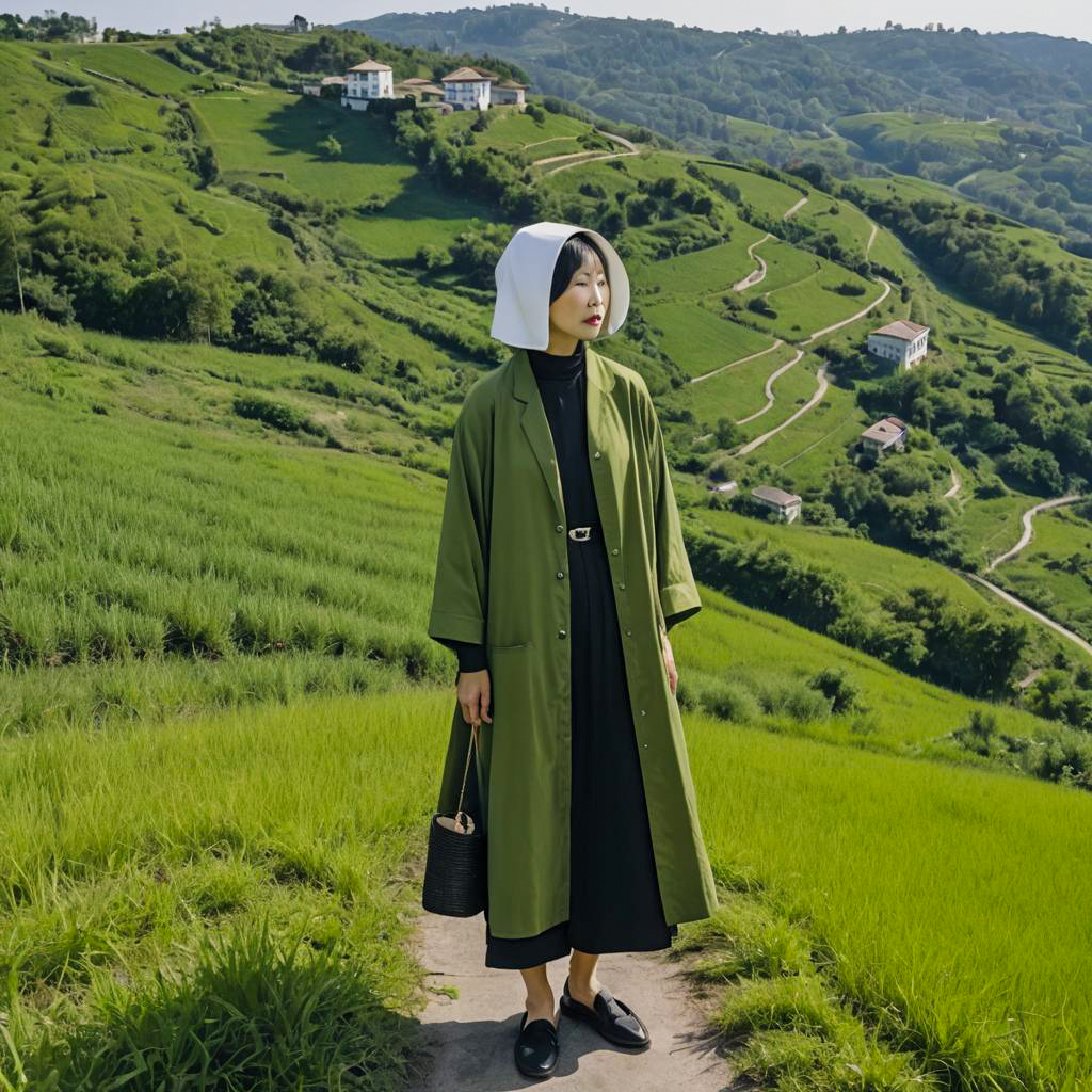 Photo of a Apple shaped woman, Textured Bob, nun outfit, black Wool habit, white Jersey coif, long Complimentary robe, chunky heels, urban rooftop, folk aesthetic