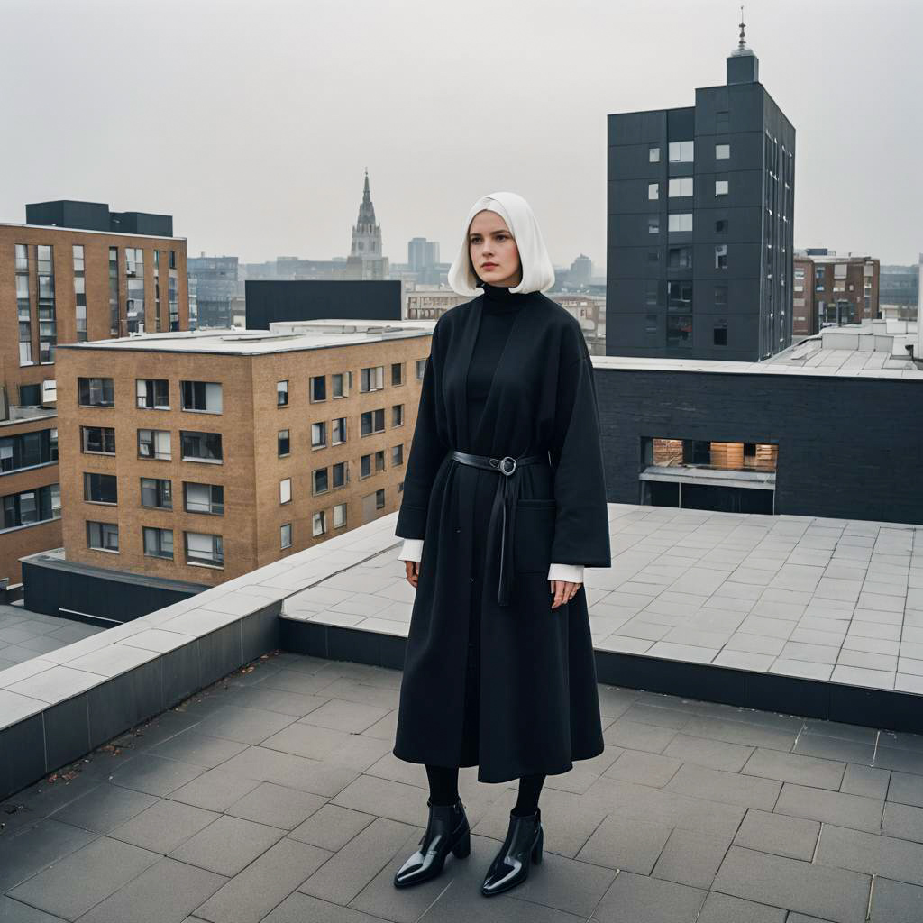 A stylish woman with a textured bob hairstyle dressed in a black wool habit and white jersey coif, wearing a long complementary robe and chunky black heeled boots, standing on an urban rooftop with a cityscape background.