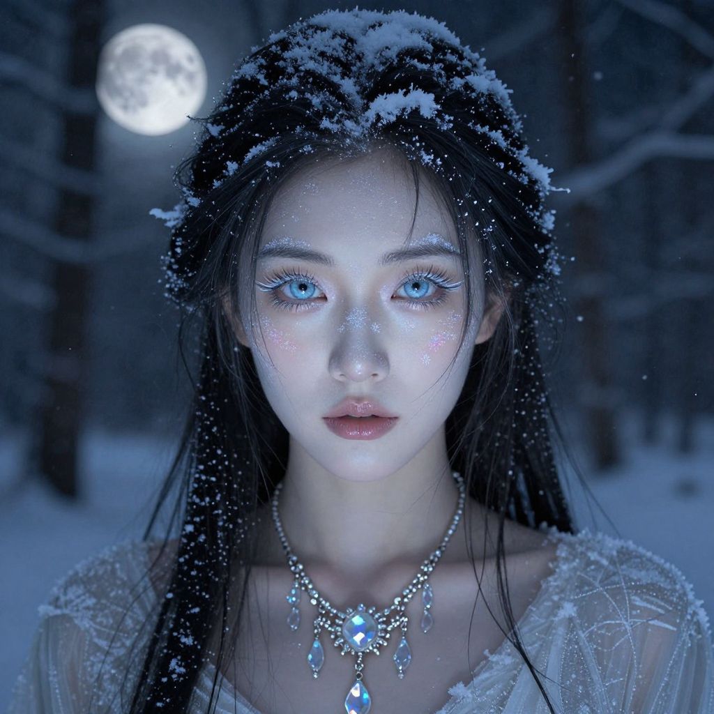 This digital artwork portrays a young woman with porcelain skin and striking blue eyes, standing in a snow-covered forest at night. Her long, dark hair is dusted with snow, and she wears a delicate, ice-blue necklace with a large, triangular pendant. Her lips are slightly parted, and her expression is serene. She is dressed in a sheer, lace-like garment that adds to the ethereal feel. The background features a full moon illuminating the dark trees, casting a soft, bluish glow over the scene. The overall color palette is cool, with shades of blue and white dominating the image.