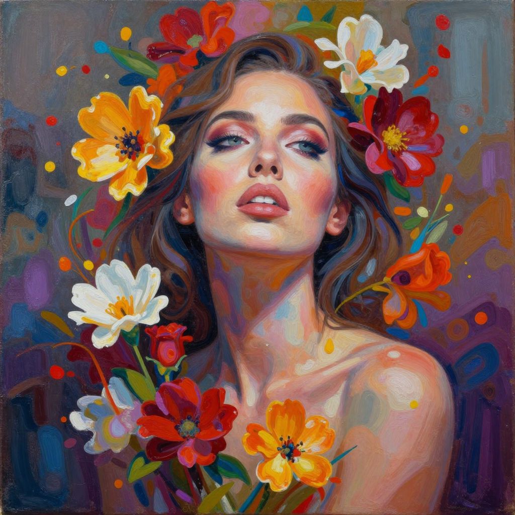 Acrylic Beautiful adult woman with her eyes looking up, upper body portrait, flowers, colorful, artistic, realistic, mysterious, powerful,