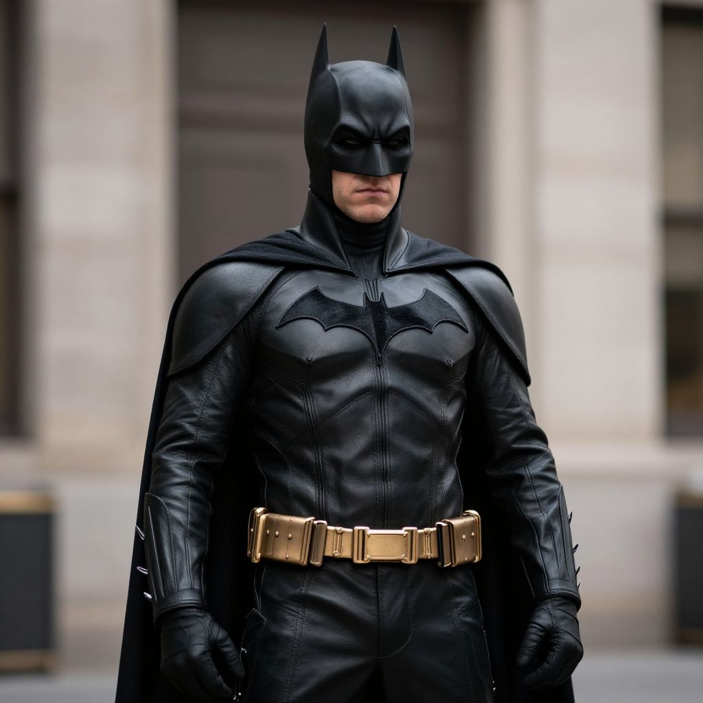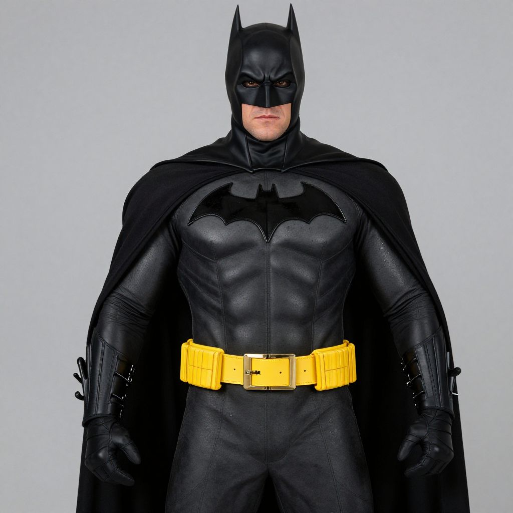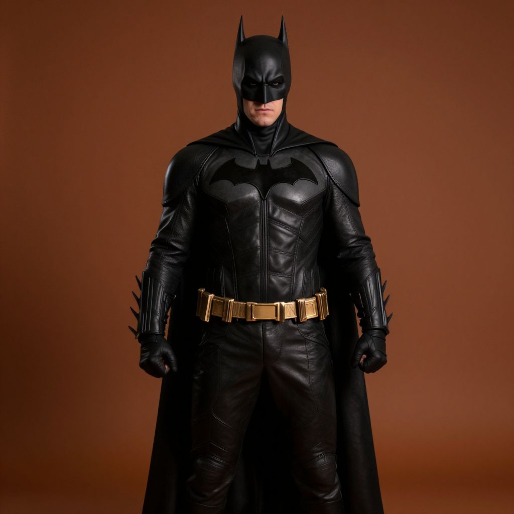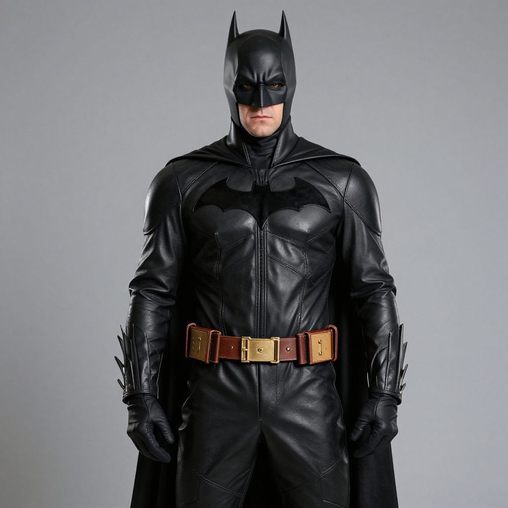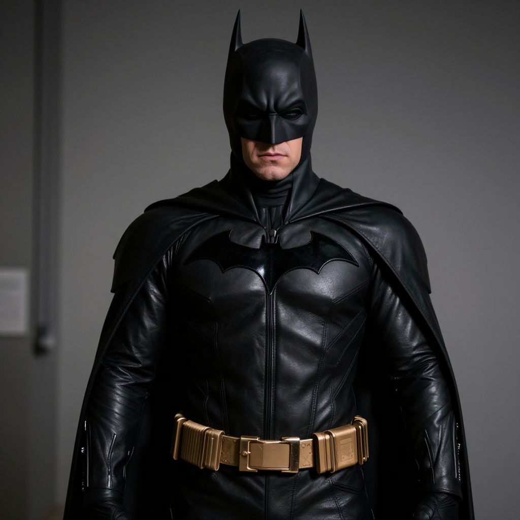 Photograph of Batman in black leather suit with bat emblem, gold belt, black cape, and mask, standing against a gray background.