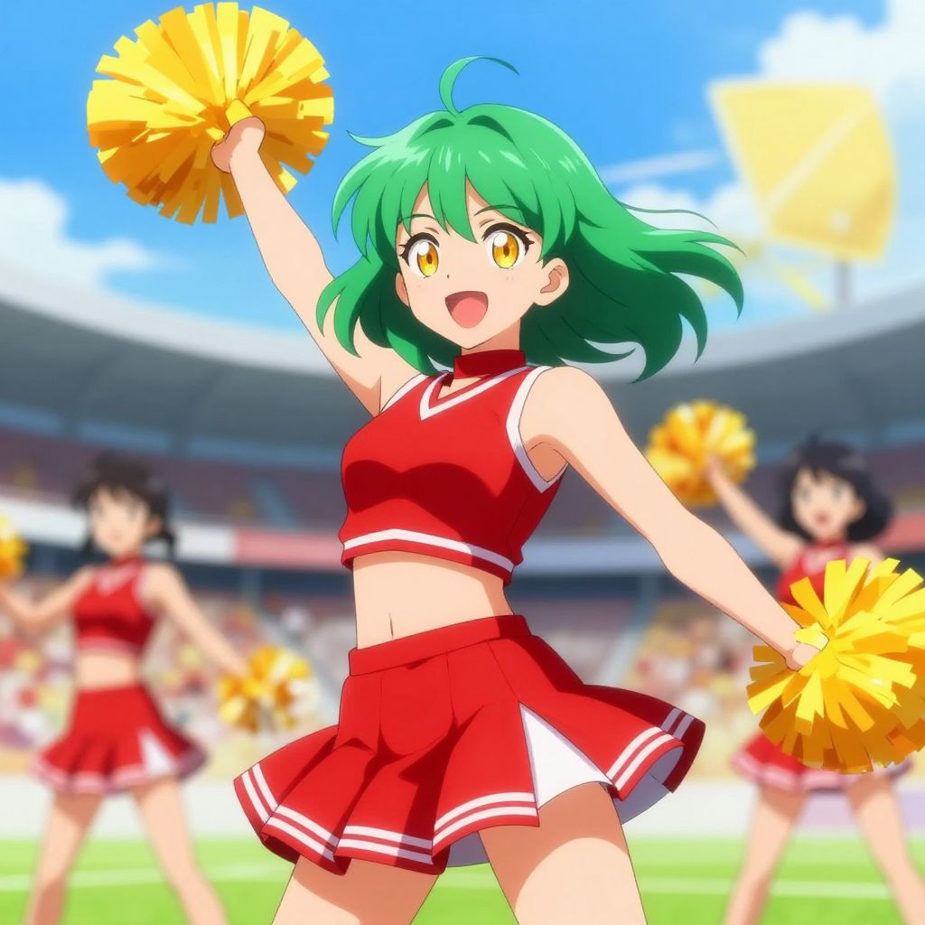 Digital illustration of a smiling anime-style cheerleader with blue hair tied with a red ribbon, dressed in a red and white cheerleading uniform with yellow pom-poms. She is in mid-air with a bright blue sky and scattered colorful confetti in the background, set on a green field.
