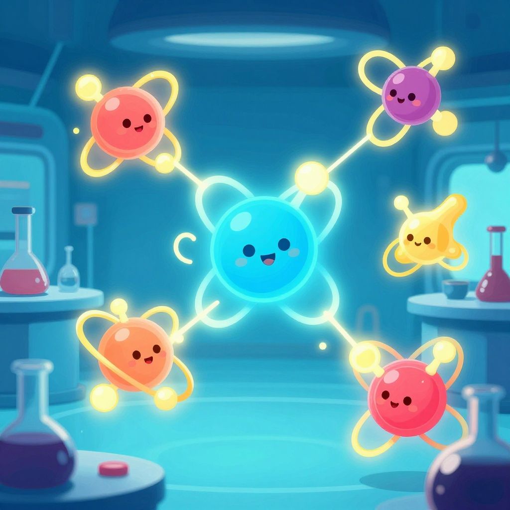 Chemical bonding cartoon of futuristic lab with friendly atoms and glowing bonds, stylized electron trails, vivid colors, playful and imaginative chemistry theme.