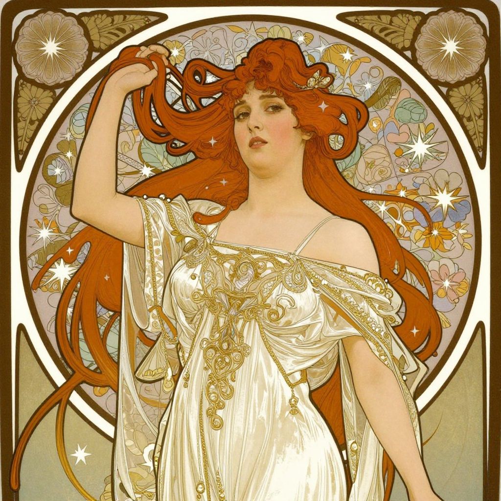 An elegant Art Nouveau-style illustration featuring a woman with flowing red hair, adorned in a delicate white gown with intricate gold embellishments, set against a circular frame decorated with floral motifs and star patterns, evoking the timeless beauty and ornate detail characteristic of Alphonse Mucha's Tres Bohèmes series.