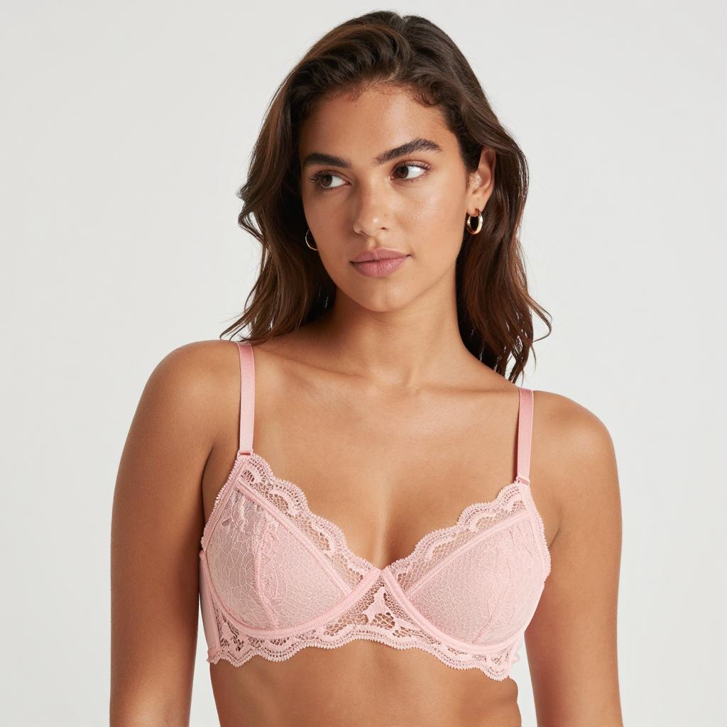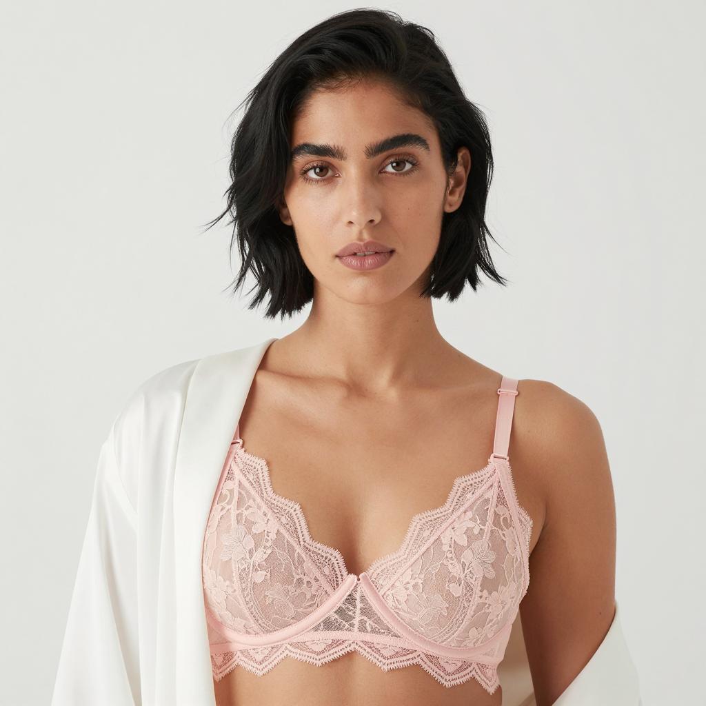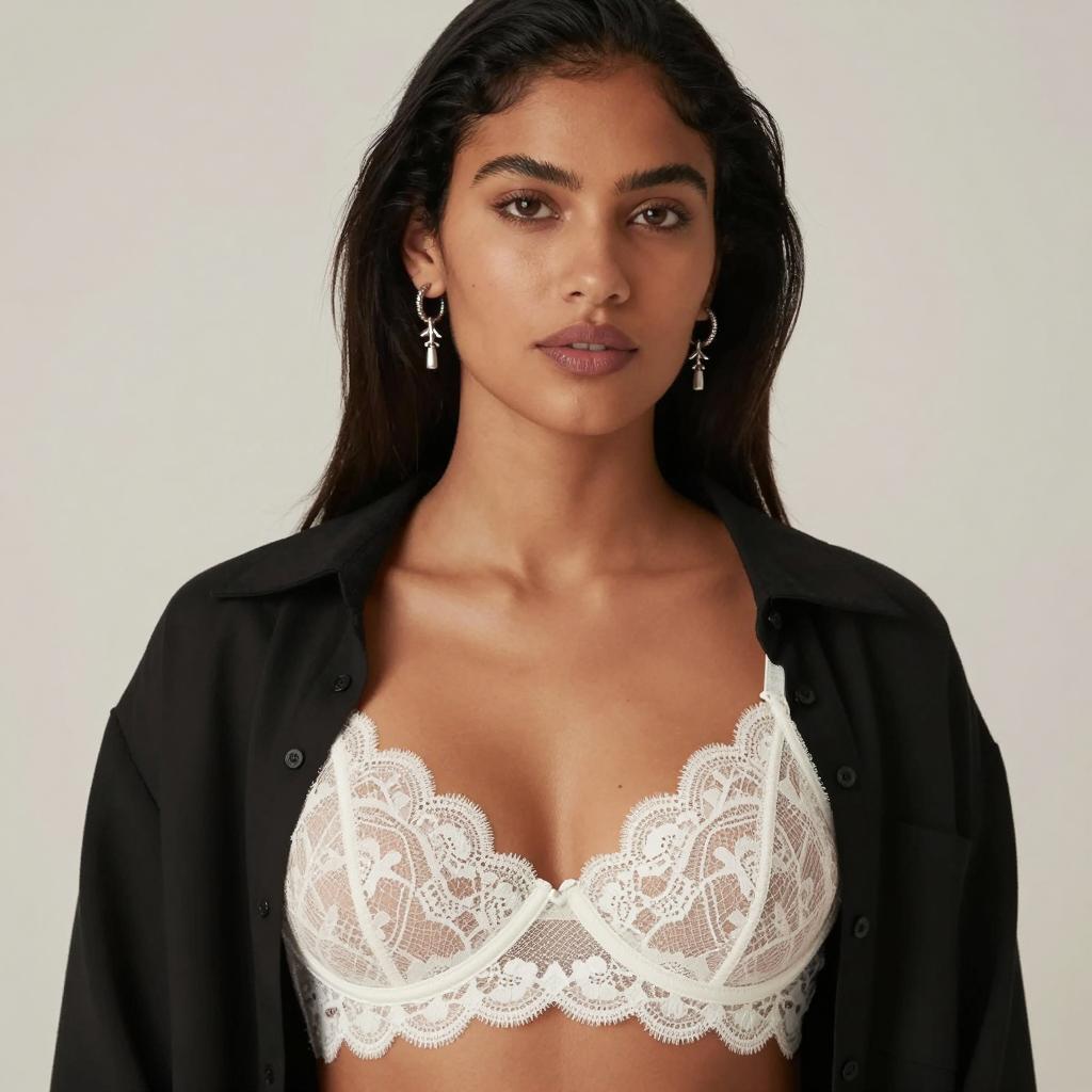 Woman with medium brown skin, black straight hair, wearing black button-up shirt, open to reveal white lace bra. Bra is padded, with intricate lace pattern. She has brown eyes, full lips, and wears dangling silver earrings. Neutral background. Upper body shot. She looks slightly to the right.